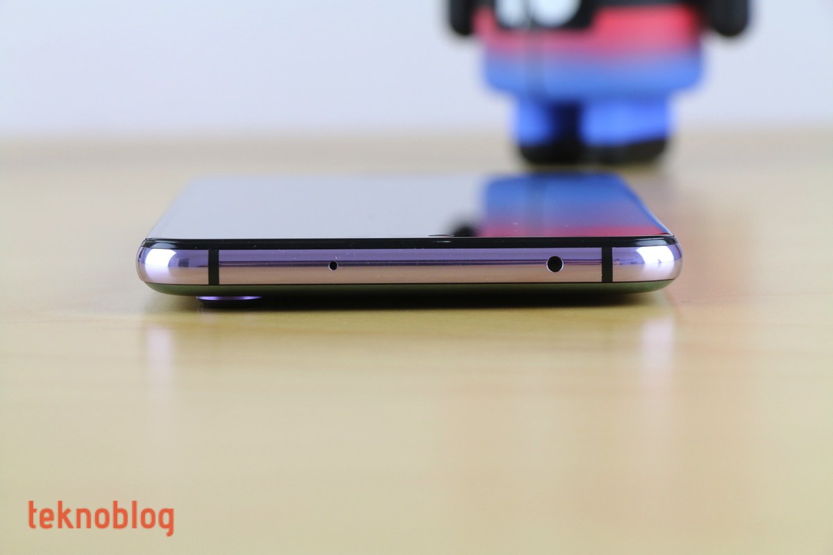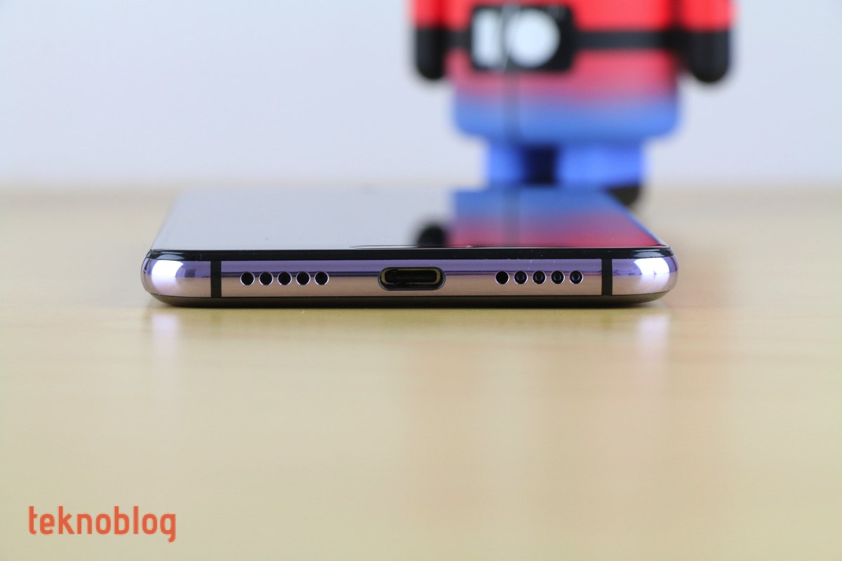Huawei P20 Pro’nun alt kenarında USB-C portu bulunurken, bunun iki yanına simetrik biçimde yerleştirilmiş ızgaraları görüyoruz. Ancak bunlardan sadece bir tanesinin arkasında hoparlör gizli. Mikrofon da diğer ızgaranın altına gizlenmiş. Huawei, burada Apple’ın iPhone’da uyguladığı yerleşimi izliyor. Üstelik P20 Pro’da da 3.5 mm. kulaklık jakı bulunmuyor. Kutudan USB-C uçlu kulaklık çıkarken, neyse ki Huawei 3.5mm adaptörünü eklemeyi ihmal etmemiş.