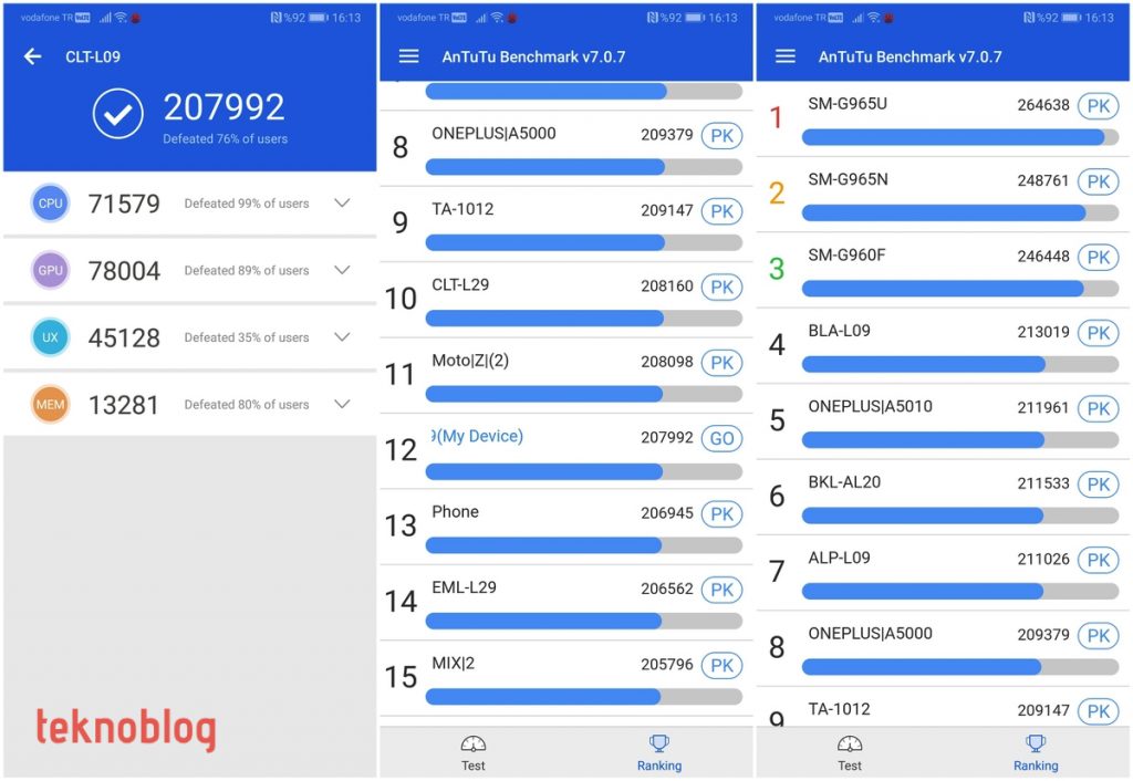 Huawei P20 Pro, GeekBench 4 benchmark testinde 1914 tek çekirdek ve 6751 çok çekirdek puanı elde etti. Bu sonuçlar onu geçen yılın ikinci yarısında çıkmış olan Exynos 8895 Octa işlemcili Samsung Galaxy Note 8 ile aynı seviyede konumlandırıyor. AnTuTu’da ise 207992 puan ile geçen yılın ikinci yarısında gördüğümüz telefonlarla aynı puanları paylaşıyor. Burada listenin tepesinde, 260000 seviyesinde puanlarla Samsung Galaxy S9 Plus yer alıyor.