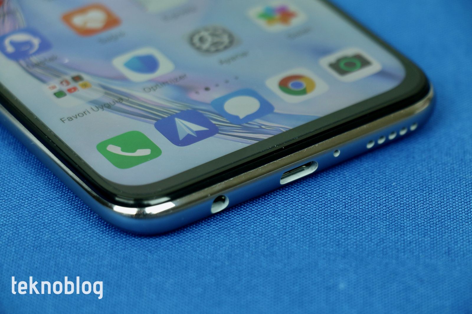 Alt kenara baktığımızda USB-C portu, 3.5mm kulaklık jakı, mikrofon ve hoparlörü görüyoruz. Üst kenarda ise ikinci bir mikrofon mevcut. Sağ kenarda ses tuşları ve güç düğmesi var. Ayrıca parmak izi okuyucu da güç düğmesine entegre edilmiş. Sol kenarda ise nano SIM kart tepsisi ve NM (Nano Memory) kart tepsisi, üst kenara doğru yerleştirilmiş.