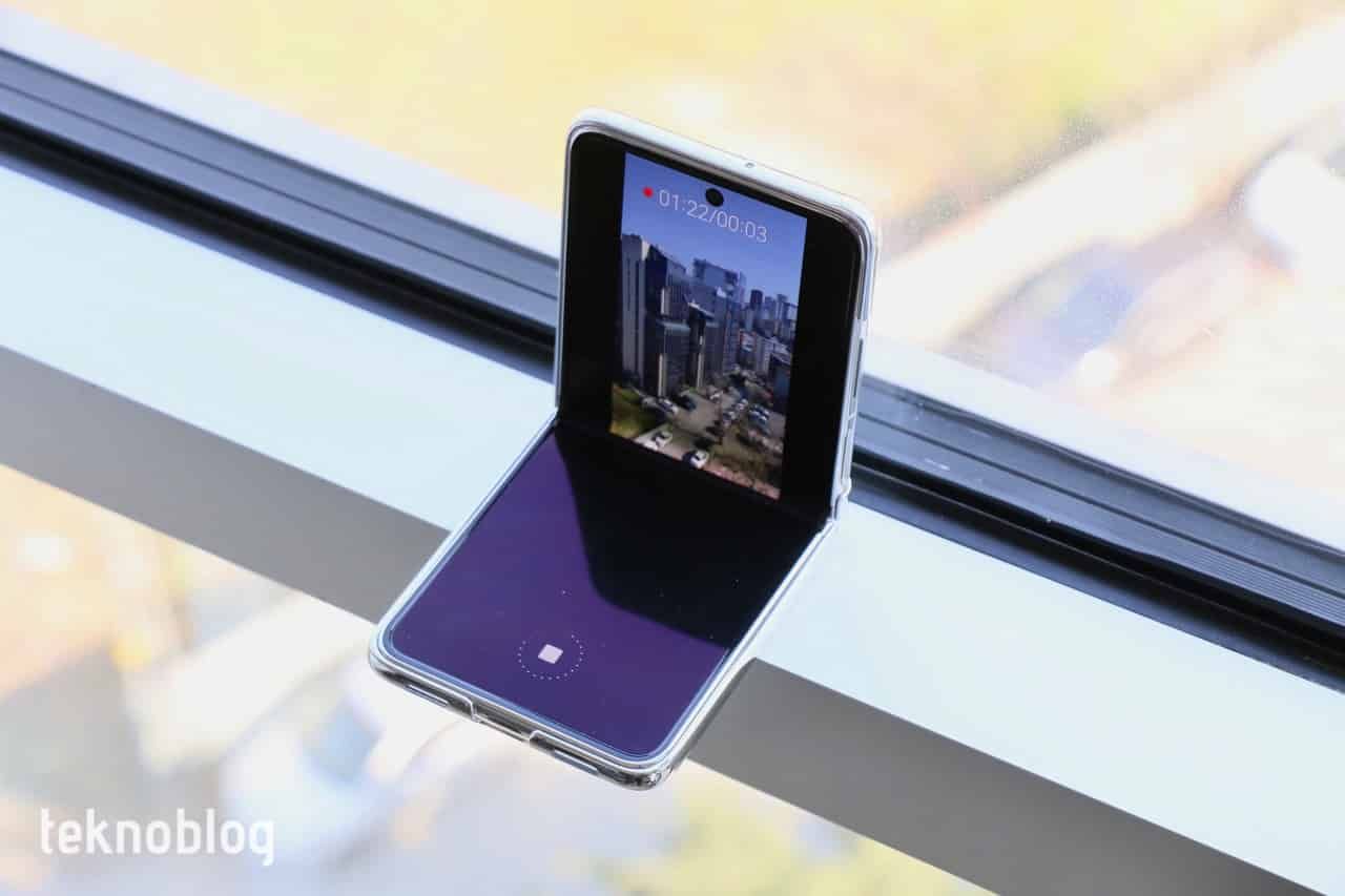 Bu telefonun katlandığında boşluksuz bir yapıya sahip olduğunu söylemiştik. Buna izin veren menteşe yapısı, P50 Pocket’ın ekranının açıldığında bombesiz, düze yakın bir yüzey elde edilmesini sağlıyor. Ekrana karşıdan bakıldığında katlanma izi hiç görünmüyor diyebiliriz, yanlardan bakıldığında da çok belli olmuyor. Ayrıca menteşe bölümündeki hafif bir çukurluğun dışında tamamen düz bir ekran hissi verdiğini de belirtmeliyiz.