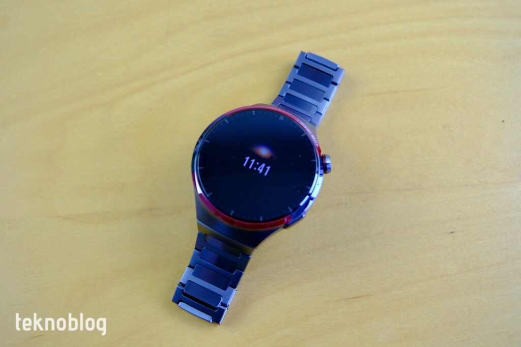 Öncelikle Watch 4 Pro Space Edition, uzaydaki çeşitli unsurlardan esinlenen tasarım dokunuşları içeriyor. Dairesel ekranın etrafını çift renkli nanokristal seramik çerçeve sarıyor. Gayet sağlam görünen bu çerçeve kırmızı ve gri renklere sahip. Renkler arasındaki geçiş pürüzsüz, sanki bir renk oyunu varmış gibi hissettiriyor. Saat, havacılık ve uzay sınıfı DLC titanyum kasayla geliyor. Bu da hafiflik ve sağlamlığı bir arada sunuyor. Saati birkaç kez kazara bir yerlere çarptım, ancak gövdede herhangi bir çizilme veya aşınma görmedim. Küresel safir cam da çarpmaların ekranda herhangi bir çatlama veya çizilmeye yol açmasını önlüyor. Bu camın çizilmelere karşı ultra dayanıklı olduğu ve normal camdan 3 kat daha sert Mohs seviyesine sahip olduğunu belirtelim.