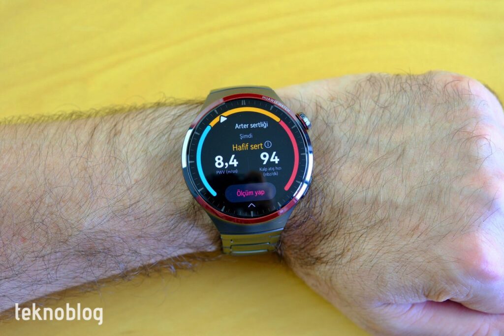 EKG analizi de, daha önce çeşitli üst sınıf Huawei Watch akıllı saatlerinde olduğu gibi Watch 4 Pro Space Edition’da da mevcut. Belli aralıklarla, saatin kenarındaki aşağı düğmeye bir süre boyunca parmağınızı temas ettirerek EKG ölçümü yapabilirsiniz. Sonuçlar bağlı telefondaki Huawei Sağlık uygulamasına kaydediliyor. Yine dolaşım sistemiyle ilgili bir başka özellik olan Damar Sertliği Takibi de var. Sağlıklı bir dolaşım sistemi için damar sertliğinin belli bir aralıkta olması önemlidir ve Watch 4 Pro da, yaptığı ölçümlerle sağlığınız konusunda size bir fikir verecek ve bir sonraki adım için harekete geçirecektir. EKG ve Damar Sertliği ölçümlerine akıllı saat üzerinde başlamadan önce bağlı telefondaki Huawei Sağlık uygulamasında etkinleştirme işlemini yapmanız gerekiyor.