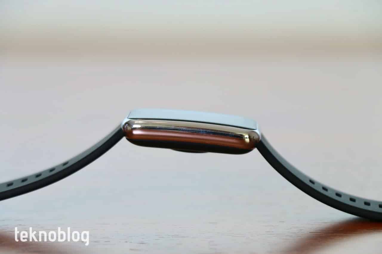 Watch Fit Elegant’ın ön yüzünü yine sağlam bir cam kaplıyor. Bu cam pürüzsüz yüzeyi sayesinde dokunmatik kontrolleri rahat biçimde gerçekleştirmeyi sağlıyor. Saatin sağ kenarında ortalanmış bir yan tuş var. Bu tuş parmak ucunuzla rahatlıkla algılayabileceğiniz kadar çıkıntı yapıyor. Tuş basma aralığı da yeterli, kullanması zahmetli değil. Yan tuşun hemen üstünde de mikrofonu görüyoruz. Saatin arka tarafında kalp hızı, kanda oksijen düzeyi gibi ölçümler için gerekli olan sensörler bulunuyor.