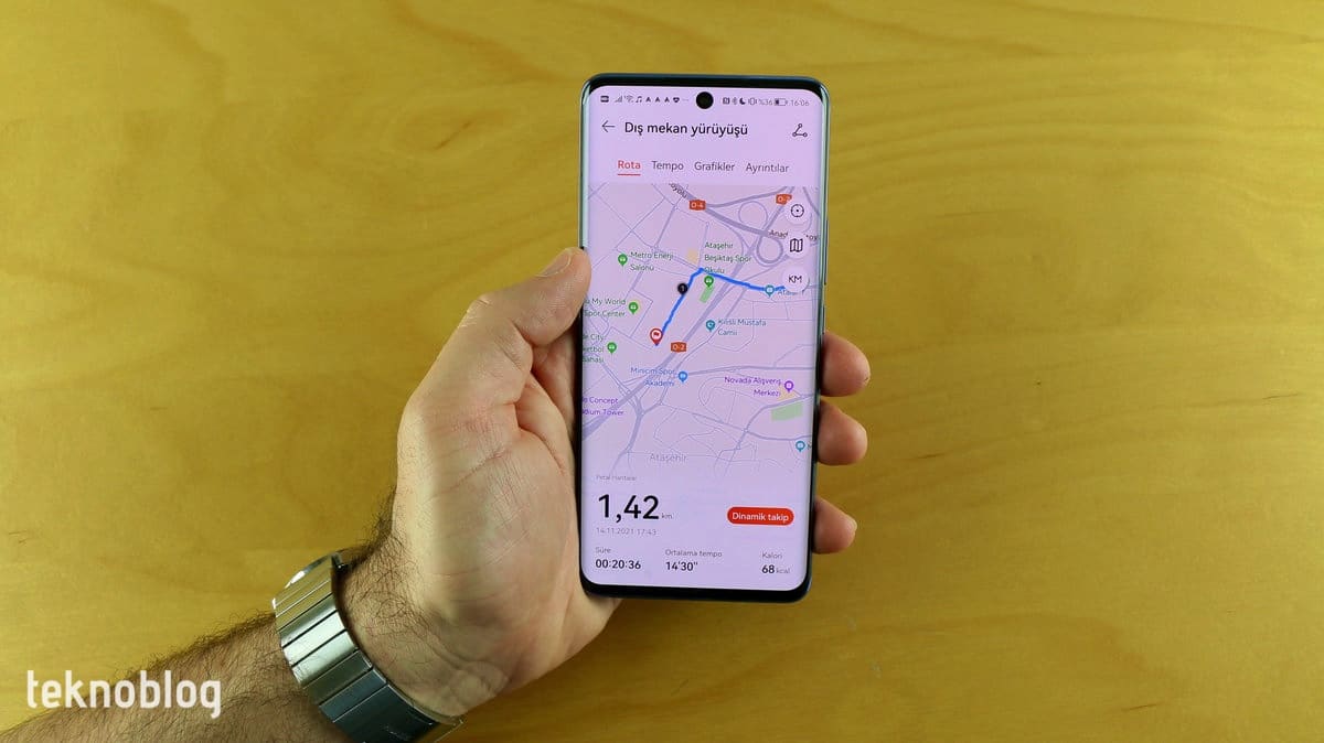 Watch GT 3, sensörler bakımından bir hayli zengin. Hızlanma sensörü, jiroskop sensörü jeomanyetik sensor, optik nabız sensörü, ortam ışığı sensörü, barometrik basınç sensörü ve sıcaklık sensörü sayesinde bu Huawei akıllı saati vücudunuzu ve bulunduğunuz ortamı, hareketleri yüksek doğrulukla algılıyor. Konum belirleme konusunda da, sahip olduğu geniş destekle dışarıda gerçekleştireceğiniz antrenmanlarda bağlı telefonu yanınıza almaya gerek bıraktırmıyor. GPS, GLONASS, BDS, Galileo, QZSS gibi beş farklı konum servisi destekleniyor. Dışarıda gerçekleştireceğiniz koşu, bisiklet gibi antrenmanlarda, başlamadan önce GPS algılamasını bekleyebilirsiniz. Ataşehir gibi, yüksek binaların bulunduğu bir yerde binaların arasından sıyrılmak, daha açık bir alana gitmek GPS sinyalinin hızlı biçimde tespit edilmesini sağlıyor. Telefonun ekranında gittiğiniz mesafeyi, basit bir harita ile birlikte anlık olarak görebilirsiniz. Daha sonra bağlı telefondaki Huawei Sağlık uygulamasındaki Egzersiz kayıtlarınıza baktığınızda da, harita üzerinde gittiğiniz rotayı görebilirsiniz. Bir telefon olmadan, tek başına oldukça yüksek doğrulukla çalışıyor. Bu rotaları arkadaşlarınızla paylaşabileceğinizi de belirtelim. Üstelik, Rota Geri Navigasyonu özelliğini açarak, kaybolduğunuz yerde Watch GT 3’ün talimatları doğrultusunda geldiğiniz yoldan geri dönebilirsiniz.