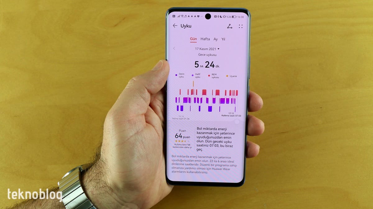 Watch GT 3’ün yakaladığı tüm sağlık kayıtlarını, bağlı telefondaki Huawei Sağlık uygulaması üzerinde detaylı veriler ve grafikler eşliğinde inceleyebilirsiniz. Üstelik Huawei, size çeşitli tavsiyeler sunuyor. Örneğin Uyku bölümünde, uyku grafiğinize bakılarak nasıl daha sağlıklı uyku çekebileceğiniz konusunda çeşitli öneriler sıralanıyor. Uyku demişken, Watch GT 3’ü deneyimlediğim süre boyunca geceleri sürekli taktım ve baklavalı kayışın herhangi bir rahatsızlık vermediğini belirtmem gerekiyor.