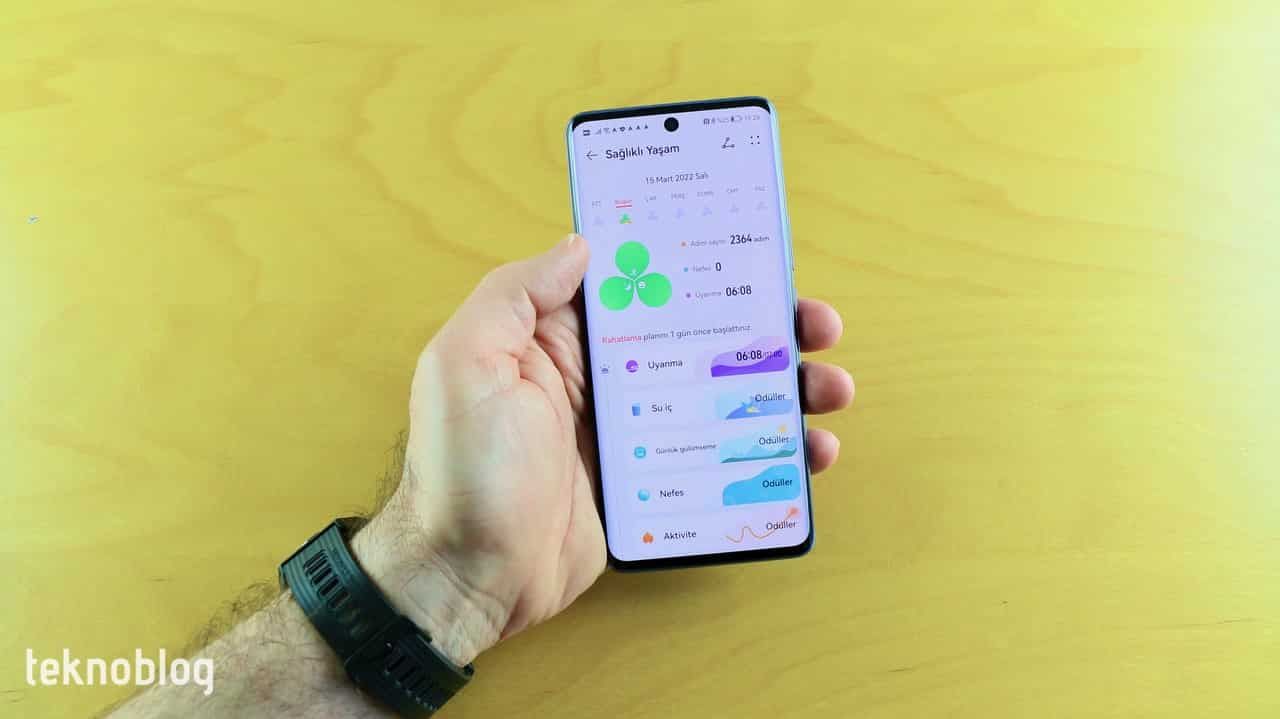 Bir de Sağlıklı Yaşam uygulaması var. Bu uygulamayı daha önce Watch GT 3’te görmüştük, ancak Türkiye için henüz etkin durumda değildi. Huawei Watch GT Runner’ı incelerken bu işlevin açıldığını gördük. Telefondaki Sağlık uygulamasında bulunan Sağlıklı Yaşam bölümüne girerek buradan hedeflerinizi belirleyebilirsiniz, daha sonra buna göre bir plan oluşturuluyor. Saatteki Sağlıklı Yaşam uygulaması üzerinden hedeflerinizi kontrol edebilir, çeşitli hatırlatıcıları doğrudan saat üzerinden alabilirsiniz.