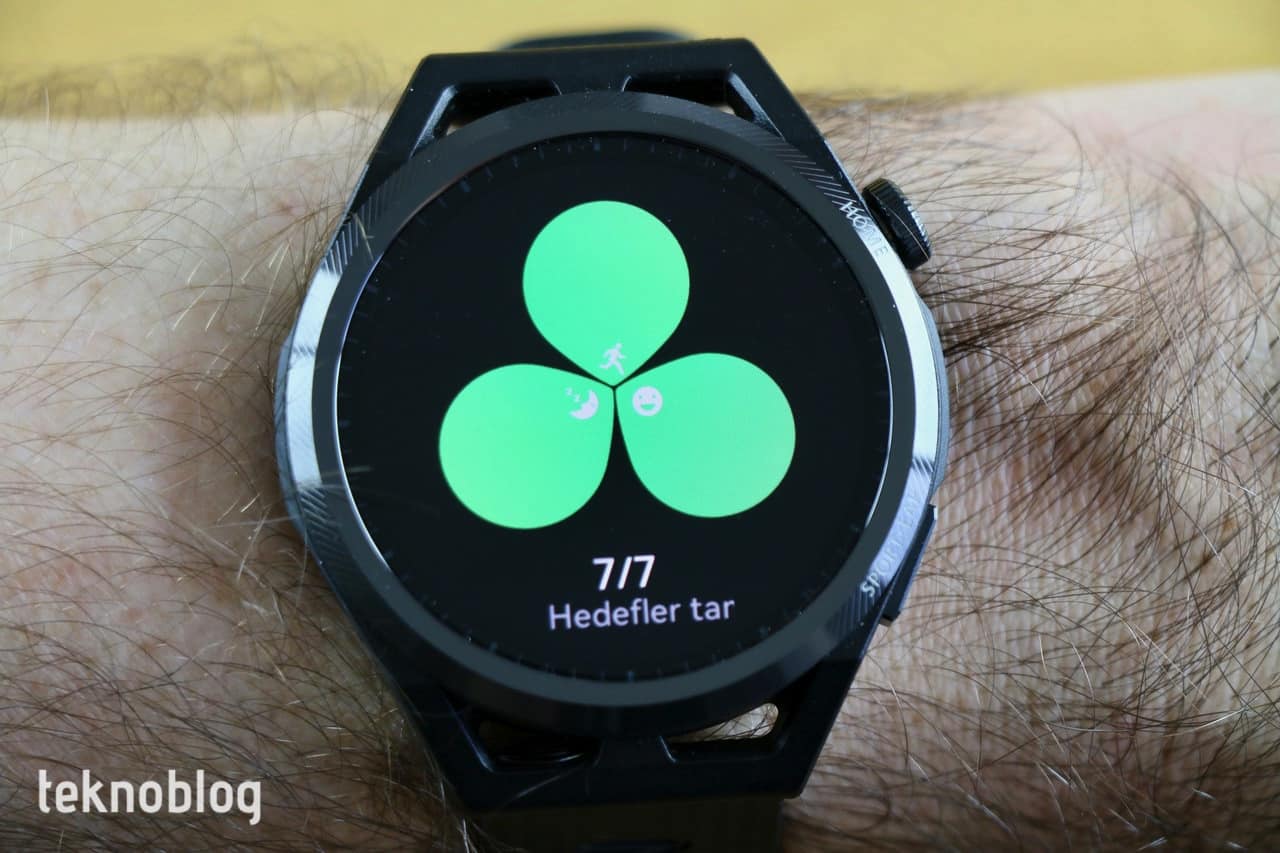 Aktivite kayıtları uygulaması ise gün içindeki kalori, mesafe, tırmanılan yükseklik, atılan adım gibi bilgileri saatin ekranında görme imkanını sağlıyor. Bu uygulama saatin büyük ekranını en iyi şekilde kullanan grafiklerle, bağlı telefona bakmaya gerek duymadan, gün içindeki gidişatınızı görme imkanı veriyor.
