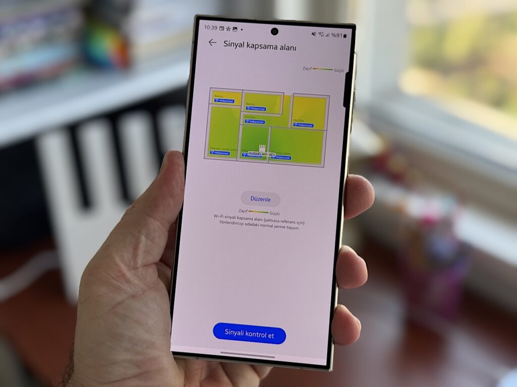 İlk testi Wi-Fi BE3’ün tam karşısında gerçekleştirdim. Wi-Fi 7 bağlantılı S24 Ultra ile 85-86 Mbps etrafında gezinirken, Wi-Fi 6 bağlantılı Z Flip 6 ile 70-72 Mbps civarlarında indirme hızlarına eriştim. Benzer bir fark yükleme hızlarında da vardı. İkinci testi evin yatak odasında yaptım. Arada bir duvar ve büyük bir gardırop var. Sinyal gücü yüksek kalırken bir önceki testtekine benzer seviyede yüksek indirme hızlarına eriştim. Yükleme hızları ise biraz daha düşük seviyede kaldı. Üçüncü testi evin en dip köşelerinden biri olan ebeveyn banyosunda yaptım. Aradaki üç duvarın ve iki tane gardırobun varlığı sinyal seviyesini düşürürken, hız konusunda Wi-Fi 7 avantaj sağlayabiliyor. S24 Ultra 70 Mbps indirme seviyesine çıkabilirken, Z Flip 6’da hız 45 Mbps civarında oldu. Yükleme testinde de aradaki fark neredeyse iki kat oranıyla S24 Ultra lehine oldu. Diğer testimiz ise evin mutfağında, yine kenar noktalarından bir tanesinde. Bu sefer WiFi BE3 ile olan mesafe daha da fazla. Bu sefer Wi-Fi 7 bağlantılı S24 Ultra, Wi-Fi 6 bağlantılı Z Flip 6’ya hem indirme hem de yükleme hızlarında fark attı. Sinyal seviyesi düşük olsa bile, Wi-Fi 7 sayesinde yüksek hız korunuyor. Wi-Fi 7 ile Wi-Fi 6 arasında son karşılaştırmalı testi ise evin salonunda, yine kenarı sayılabilecek bir noktada yaptım. Bu sefer BE3 ile arada bir duvar, bir kütüphane ve yaklaşık 5 metrelik ek mesafe var. Bu durumda Wi-Fi 7 ile 100 Mbps’nin hemen altında bir indirme ve 20 Mbps’ye çok yakın yükleme hızı elde ettim. Wi-Fi 6 ile bu değerlerin yanına yaklaşmak pek mümkün olmadı. Bu testler, Wi-Fi 7 ile sahip olunan geniş alan bağlantısından mümkün olan en yüksek verimi almanın mümkün olduğunu görüyoruz.