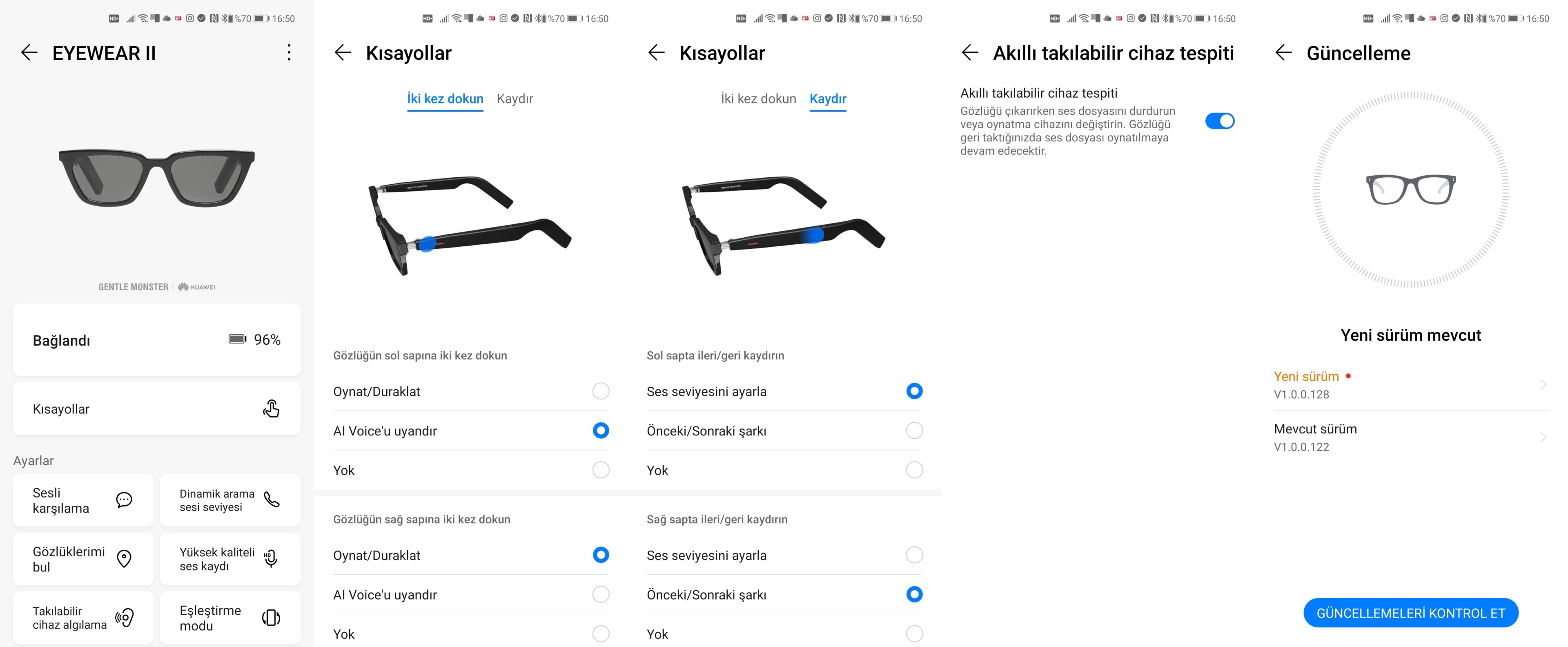 Daha önce yayınladığımız Eyewear 2 kutu açılımı videosu ve yazısında, gözlüğün Huawei Mate 40 Pro ile nasıl kurulduğunu göstermiştik. Tıpkı FreeBuds Pro gibi diğer aksesuarlarda olduğu gibi, EMUI 10 veya üzeri bir cihazla kurulum sırasında AI Life uygulamasını kullanmanıza gerek yok. Ancak bu uygulama sayesinde gözlüğün kontrolü ve özelleştirilmesi için elinizeki seçenekler fazlalaşıyor. AI Life sayesinde ayarları yapma, gözlük üzerindeki kontrolleri özelleştirme veya yazılım güncellemelerini yapma gibi işleri gerçekleştirebilirsiniz.