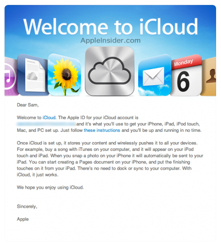 Hoşgeldin mesajında kullanıcıların Apple hesaplarının iCloud hesaplarına erişim ve iPhone, iPad, iPod touch, Mac / PC’lerde iCloud hesabının kurulumu için kullanılacağı haber veriliyor. Mesajda kurulum adımlarını ve kullanımı anlatan sayfaya yönlendiren bir bağlantı da paylaşılmış, ancak bu bağlantıya tıklandığında hata mesajıyla karşılaşıldığı belirtiliyor. E-posta iletisinde iCloud’ın, iPhone’da çekilen fotoğrafın otomatik olarak iPad’de de görünmesi gibi yeteneklerine atıfta bulunuluyor.
