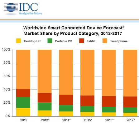 Araştırma şirketi IDC küresel bağlı cihaz pazarına ait yeni rakamları yayınladı. PC, akıllı telefon ve tabletlerin dahil olduğu grubun 2013 yılının genelinde yüzde 27.8 oranında büyümesi beklenirken, bu büyümenin itici gücünün akıllı telefon ve tabletler olacağı ifade edildi.