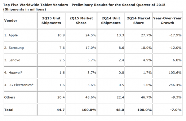 Listede Apple ve Samsung’u sırasıyla Lenovo, Huawei ve LG izliyor. Huawei ve LG’nin sevkiyat rakamlarının birbirleriyle aynı olduğunu ayrıca belirtmek gerekiyor. IDC’ye göre, tablet pazarındaki değişimin yeni modelleri ve farklı tablet standartlarını beraberinde getirmesi muhtemel gözüküyor.