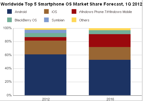 Tüm akıllı telefon pazarının 2012 ve 2016 yılları arasındaki durumuna ışık tutan IDC raporuna göre Android pazardaki hakim oyuncu olarak yer almaya devam edecek, ancak payı yüzde 61’den yüzde 53’e gerileyecek. iOS ve BlackBerry’nin önümüzdeki dört yıl boyunca pozisyonlarını koruması bekleniyor. Apple için normal sayılabilecek bu durum RIM için de bir o kadar şaşırtıcı sayılmalı. Windows Phone ise IDC’nin raporuna göre en büyük yükselişi gerçekleştirecek mobil platform olarak dikkat çekiyor. 2012 için yüzde 5.2’lik pazar payı biçilen Windows Phone’un 2016’ya gelindiğinde pazarın yüzde 19.2’sini ele geçireceği ve böylelikle iOS’i geçeceği tahmin ediliyor.