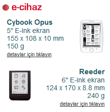 idefix sadece e-kitap sunmakla kalmıyor, tüketicilerin bu e-kitapları rahatlıkla okuyabilmesi için uygun cihazları da satışa sunuyor. Şu an için iki farklı cihaz seçeneği sunuluyor. Bu iki cihazın ilki KDV dahil 649 TL’lik fiyata sahip olan Reeder. 802.11b/g WiFi destekli bu e-kitap okuyucusunun kapasitif dokunmatik, 600 x 800 çözünürlüklü ekranı SiPiX BenQ e-ink teknolojisiyle üretilmiş. 240 gr ağırlığındaki bu cihazın dahili internet tarayıcısı internette gezinmenize de olanak sağlayacak. İkinci e-kitap okuyucu ise Cybook Opus. 155 x 108 x 10 mm’lik boyutlara ve 150 gr ağırlığa sahip olan bu cihazın 1 GB’lık flaş belleği bulunuyor. 5 inç’lik e-ink ekranı 600 x 800 çözünürlük sunarken HTML, TXT, JPG, GIF ve PNG gibi formatlar da destekleniyor. Bu cihazlarla ve idefix’in e-kitap projesiyle ilgili ayrıntıları yazının devamındaki ilgili bağlantılardan alabilirsiniz.