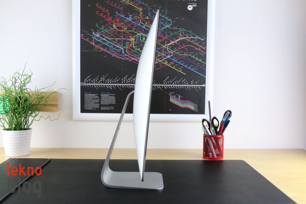 Giriş bölümünde de belirttiğimiz gibi, iMac’lerde en son büyük tasarım değişikliği 2012 yılının sonlarında gerçekleşti. DVD sürücüsünün kaldırılmasıyla birlikte profil daha da incelmişti. O tasarım aynı şekilde korunmaya devam ediyor. Ofisimizde bulunan 2013 model iMac ile bu 2017 model iMac’i yan yana koyup önden baktığımızda ayırt etmemiz neredeyse imkansız. Yıllardır aynı kalmasına rağmen, iMac yine en çekici monitör bilgisayarlardan bir tanesi olmayı başarıyor. Metal gövdesi, önde ve arkada bulunan siyah renkli Apple logoları, konik biçimde kenarlara uzanan arka paneli, geniş sayılabilecek açısı sayesinde ekranın düşey yönde hareketine de izin veren ayağı ile iMac, oldukça kullanışlı. Dizüstü bilgisayarların aksine, masaüstü veya monitör bilgisayarları taşımak kolay değildir. Ancak 21.5 inç ekranlı iMac hem boyutları hem de ağırlığı itibarıyla taşımaya biraz daha elverişli bir ürün gibi görünüyor. Eğer büyükçe bir poşet veya çantanız varsa, iMac’i bunun içine yerleştirip farklı ortamlara taşıyabilirsiniz. Biz, deneyimlediğimiz süre boyunca iMac’i ev ve ofis arasında bu şekilde taşıdık.