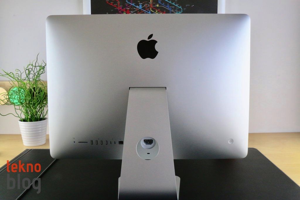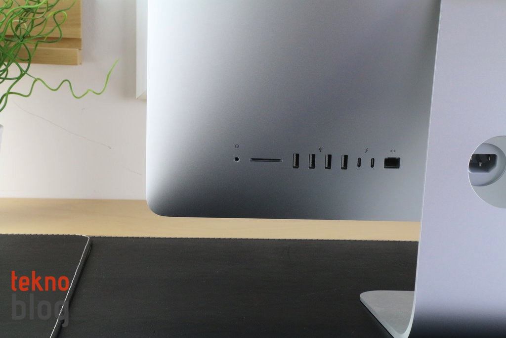 Arkadan bakıldığında, sol alt köşeye denk gelecek şekilde portlar yerleştiriliyor. Çalışma esnasında ise bu portlar size göre sağ alt köşede, arkada bulunuyor ve el yordamıyla da rahatlıkla erişmeniz mümkün oluyor. 2017 model iMac’lerle birlikte bağlantı seçenekleri biraz daha zenginleşiyor. Apple dört adet USB 3.0 portunun yanına iki adet de yüksek hızlı Thunderbolt 3 portu ekliyor. USB-C formundaki bu portlar ile saniyede 40 Gbps’ye varan veri iletim hızlarına ulaşmak mümkün oluyor. Bu da iMac’e yüksek depolama kapasitesine ihtiyaç duyan kullanıcılar için daha hızlı veri transferi imkanı sağlayan USB-C veya Thunderbolt 3 portu harici diskleri bağlama fırsatı veriyor. Aynı zamanda bu Thunderbolt 3 portları harici monitörleri bağlamak için de kullanılıyor. SDXC kart yuvası, Gigabit Ethernet portu ve kulaklık jakı da diğer bağlantı seçenekleri arasında bulunuyor. Bağlantı elemanlarının hemen yanında güç bağlantı noktası yer alırken, aynı doğrultuda diğer uca ilerlediğinizde açma-kapatma düğmesini görüyorsunuz.