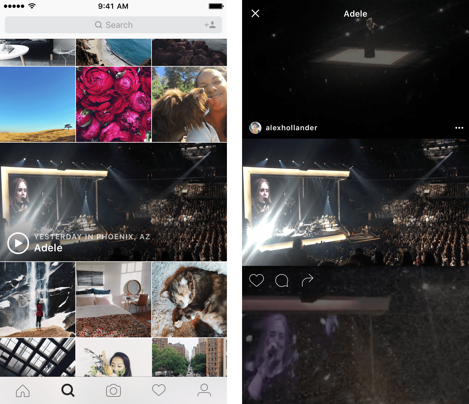 Keşfet sekmesine eklenen etkinlik video kanalı, dünyanın dört bir yanındaki etkinliklerden en güncel ve etkileyici anları akıllı telefonlara taşıyacak. Konserler, spor müsabakaları ve tiyatro performansları söz konusu etkinlikler arasında yer alıyor. Dolayısıyla büyük bir festivalden ya da kaçırılan bir konserden görüntüler izlemek isteyenler için Instagram en uygun adreslerden birine dönüşüyor.