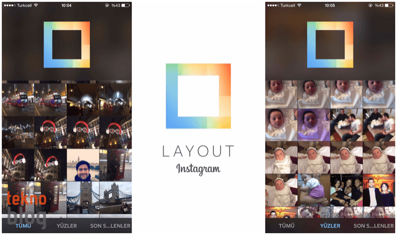 Layout’un ana ekranının altında bulunan araç çubuğundan Yüzler sekmesine geçiş yapıldığında ise film rulosunda saklanan ve yüzlerin gösterildiği fotoğraflar listeleniyor. Böylelikle sadece yüzlerin gözüktüğü fotoğrafları birleştirmek isteyenlerin işi kolaylaşıyor. Ana ekran üzerinden erişilen son seçilenler sekmesinde ise Instagram Layout’ta birleştirilmesi için seçilen son fotoğraflar bir araya getiriliyor.