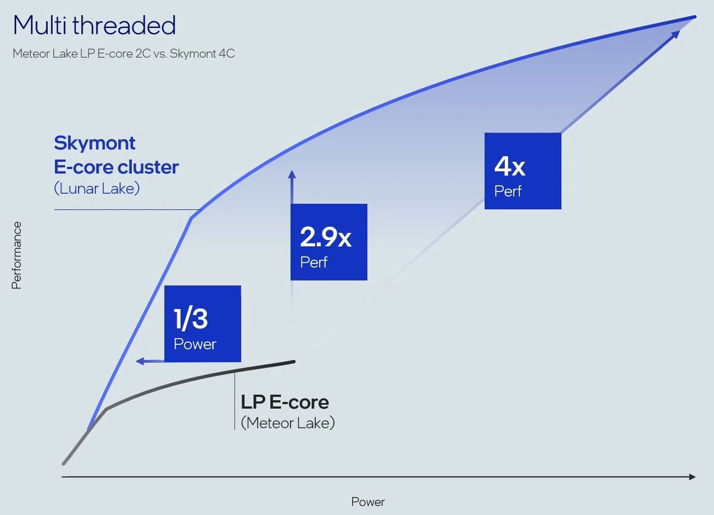 E-çekirdekler, bir LP-E çekirdeğinin hızında çalışırken üçte bir oranında daha az güç tüketiyor. Ayrıca, tek iş parçacıklı performansta iki katına, çok iş parçacıklı performansta ise dört katına kadar ölçeklenebiliyor. Bu yapı, kullanıcıların daha düşük güç tüketimi ile yüksek performans elde etmelerini sağlıyor.