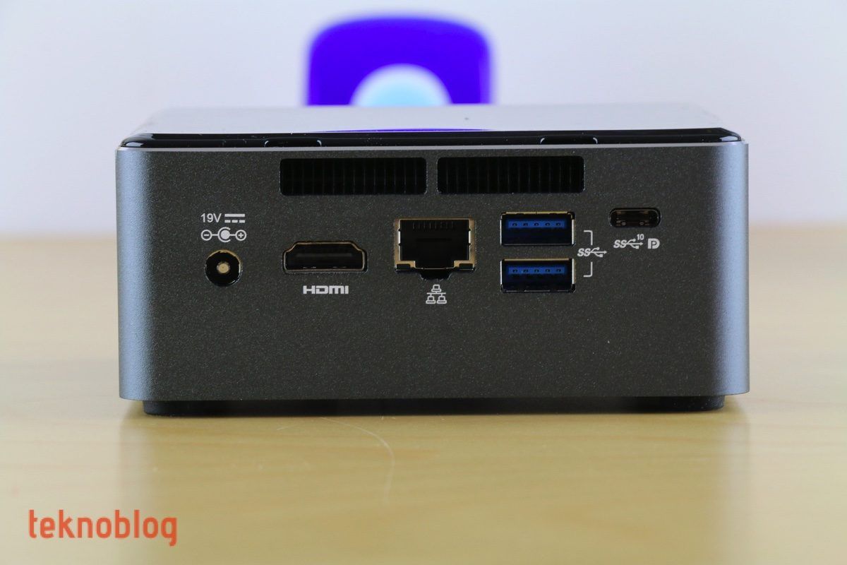 Arka tarafa baktığımızda birtakım giriş ve çıkışları görüyoruz. Güç konnektörü, HDMI 2.0 çıkışı, Gigabit Ethernet portu, iki adet USB 3.0 portu, bir adet USB 3.1 gen2 ve DisplayPort 1.2 destekli USB-C portu burada mevcut durumda. Elimizdeki Core i3 işlemcili modelin USB Type-C üzerinden ThunderBolt desteği sunmadığını belirtmeden geçmeyelim.
