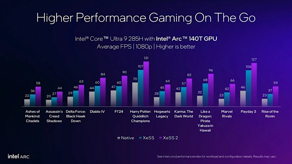 Intel’in XeSS 2 teknolojisi sadece bağımsız grafik kartlarını değil, aynı zamanda entegre Arc GPU barındıran belirli işlemcileri de destekliyor. Özellikle Intel Core Ultra 9 285H gibi yeni nesil işlemciler, yerleşik Arc 140T grafik birimi sayesinde bu teknolojiyi doğrudan kullanabiliyor. Böylelikle entegre grafik çözümlerinde de 1080p çözünürlükte 60 FPS üzeri oyun deneyimi mümkün hale geliyor. Marvel Rivals ve Hogwarts Legacy gibi örneklerde bu fark daha net şekilde görülebiliyor.