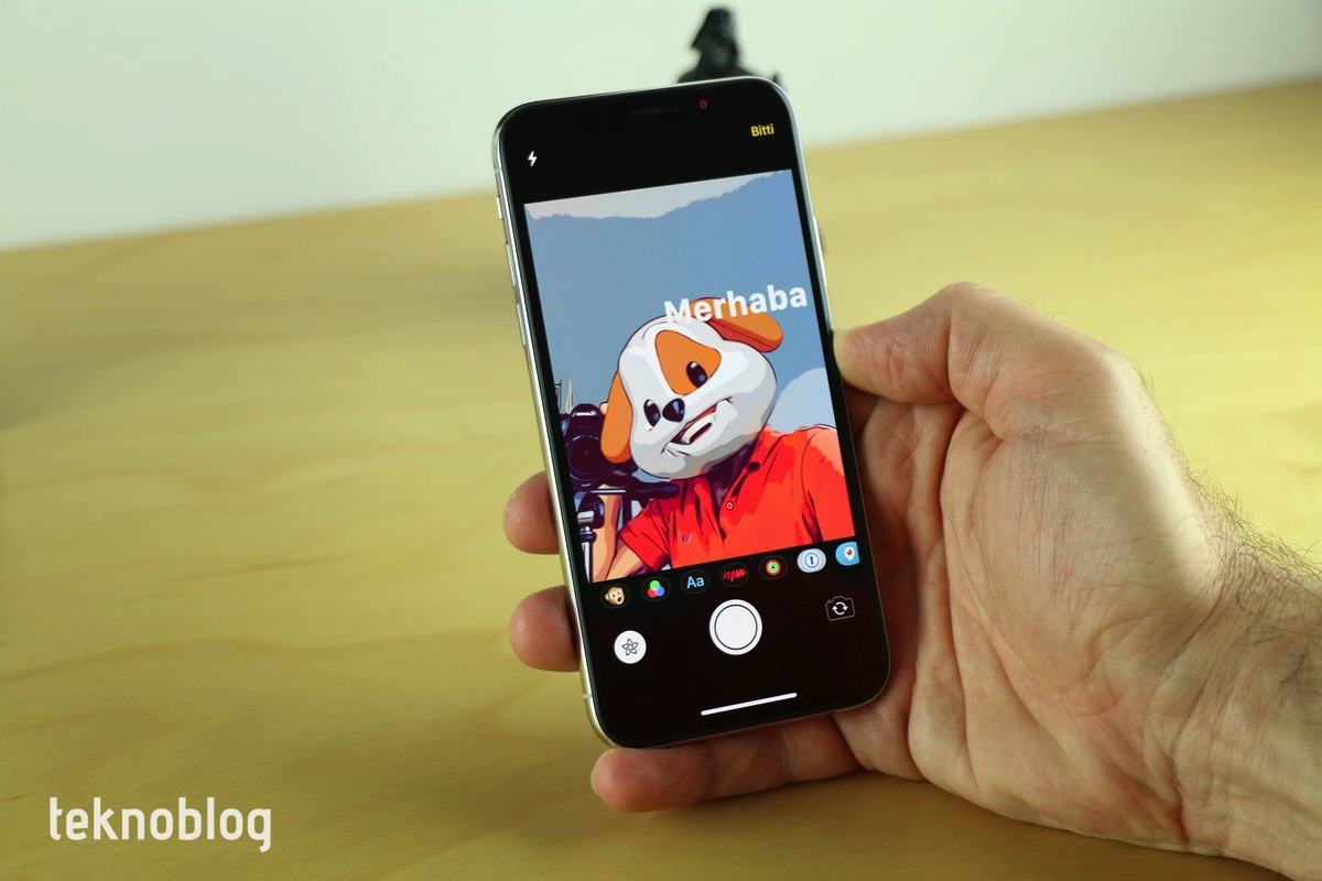 Kamera Efektleri düğmesine tıklattığınızda; filtreler, metin, şekiller gibi araçları görüyorsunuz. iPhone X’da burada Animoji aracı da var. Ayrıca iMessage uygulamalarından da çıkartmaları kullanmak mümkün. Animoji veya Memoji seçtiğinizde sizin başınızın üstüne bu görüntü bindiriliyor. Şekiller ve metinler de başınızın hareketlerine göre hareket ediyor. Efektleri ekledikten sonra fotoğraf çekebileceğiniz gibi, önce fotoğraf çekip daha sonra efektleri ekleyebilirsiniz. Paylaşımdan önceki son ekranda diğer düzenlemeleri yapabilir veya elle çizim veya not ekleyebilirsiniz.