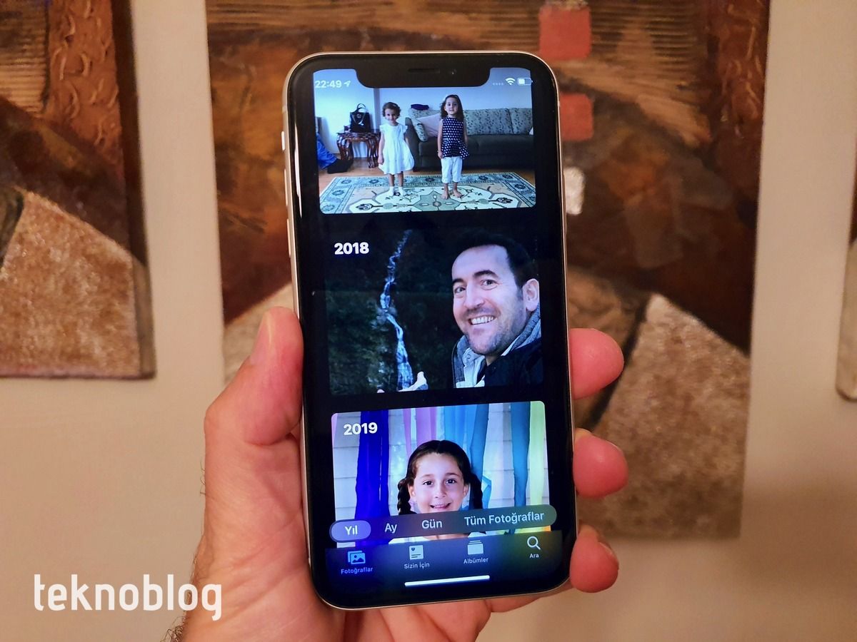 Fotoğraflar uygulamasını açtığınızda karşınıza çıkan Fotoğraflar sekmesi içinde; üstünde Yıl, Ay, Gün ve Tüm Fotoğraflar yazan bir çubuğu alt kısma yerleştirilmiş şekilde göreceksiniz. Bu çubuk, sekme içinde ikinci bir sekme işlevi görüyor. Fotoğraflarda yıl, ay veya gün bazında gruplanarak gösteriliyor. Tüm Fotoğraflar görünümünde ise parmağınızı kıstırarak veya açarak fotoğraf yığını içinde hızlı biçimde gezinebilirsiniz.