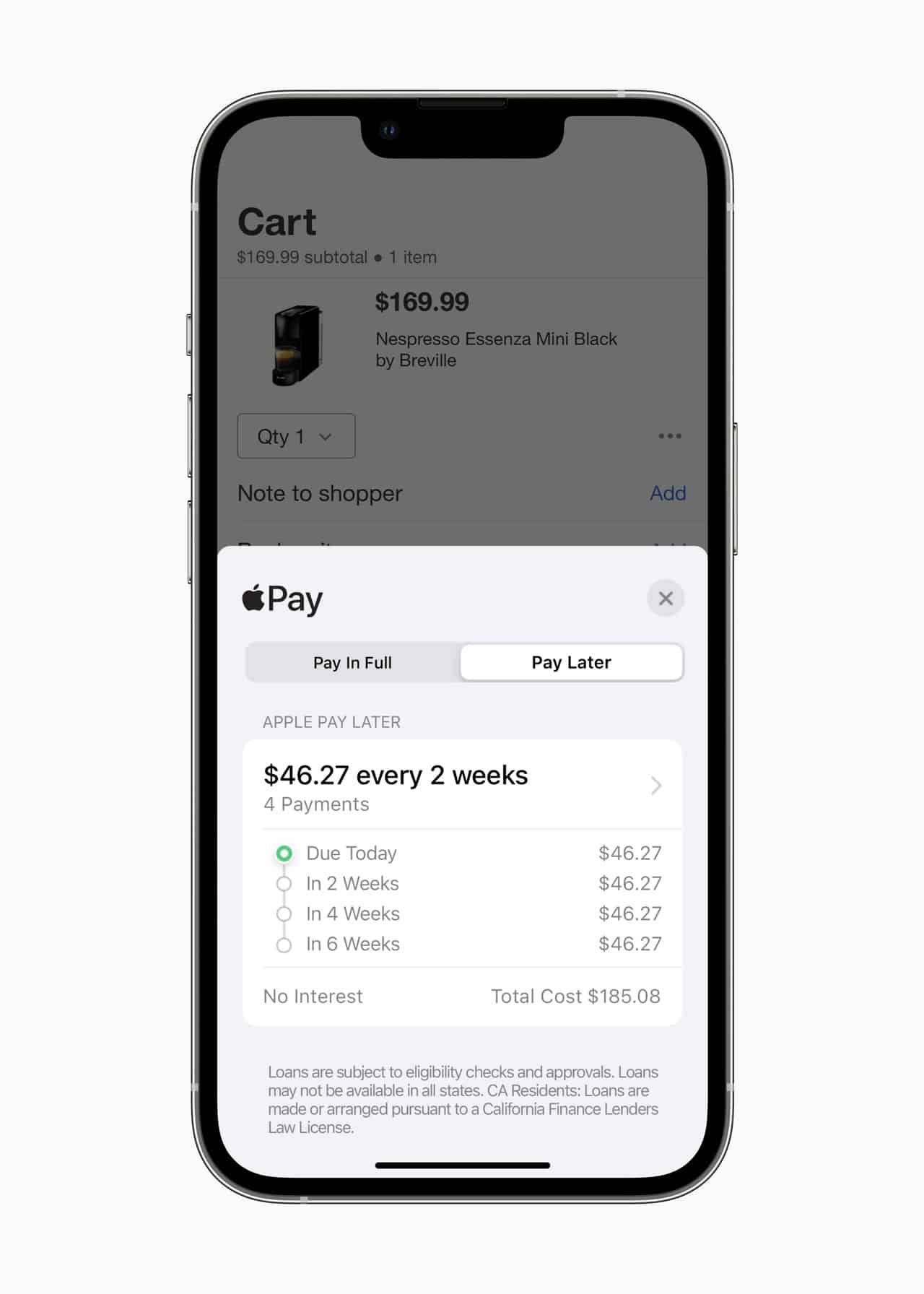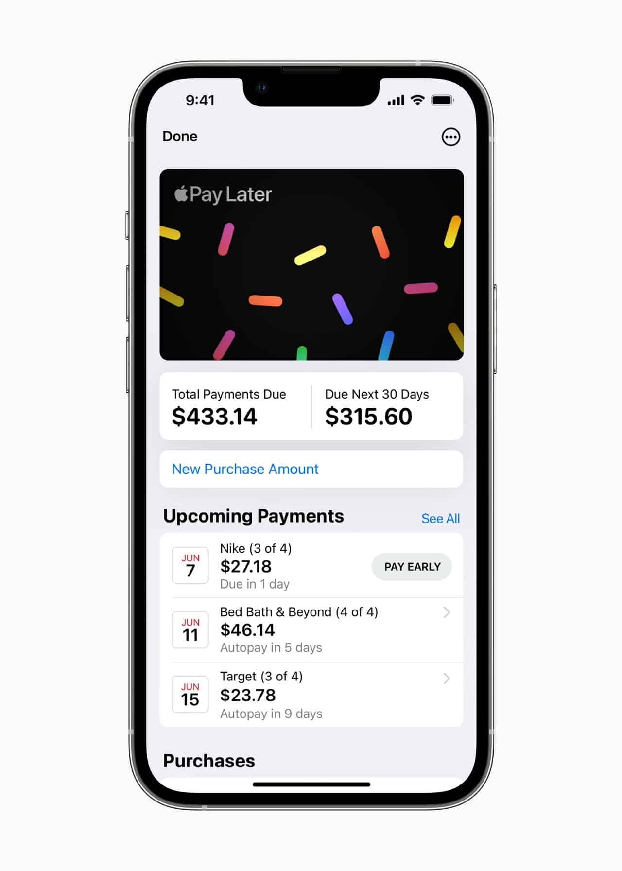 Apple Pay Later, ABD’deki kullanıcılara Apple Pay ile yapılan bir satın alma işleminin maliyetini, sıfır faizle ve hiçbir ek ücret olmadan altı haftaya yayılan dört eşit taksitle ödemenin sorunsuz ve güvenli bir yolunu sunuyor. Apple Wallet içine yerleştirilen ve tüketicilerin finansal durumu düşünülerek tasarlanan Apple Pay Later sayesinde Cüzdan’dan Apple Pay Later ödemelerini görüntülemek, takip etmek ve yeniden ödeme yapmak kolaylaşıyor. Kullanıcılar Apple Pay ile ödeme yaptıkları sırada veya Cüzdan uygulamasından Apple Pay Later için başvuru yapabiliyor. Mastercard ağını kullanan Apple Pay Later, Apple Pay’in online olarak veya uygulama içinden kabul edildiği her yerde kullanılabiliyor Apple Pay Sipariş Takibi ise kullanıcıların, Apple Pay ile katılımcı satıcılardan yaptıkları alışveriş işlemlerine ait ayrıntılı makbuzları ve sipariş takibi bilgilerini Cüzdan uygulamasından içinden almalarını sağlıyor.