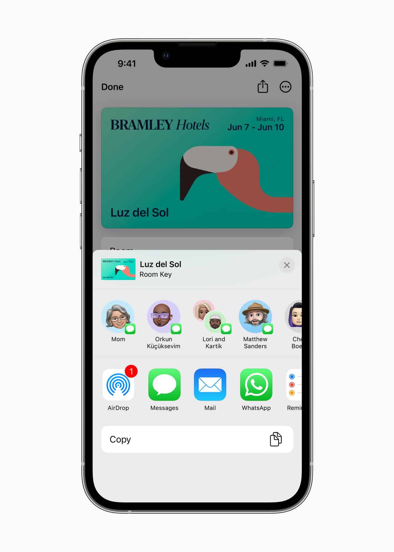 Cüzdan uygulamasındaki anahtarlar ve kimlikler için sunulan desteğin kapsamı genişletiliyor. Kullanıcılar, kimlik ve yaş doğrulamasını zorunlu tutan uygulamalarda Cüzdan uygulamasındaki kimliklerini kullanabiliyor. Gizli ve güvenli bir deneyim sağlamak amacıyla, uygulamaya yalnızca işlem için gereken bilgiler aktarılıyor ve kullanıcılar, Face ID ya da Touch ID’lerini kullanarak bilgileri inceleyip bu bilgilerin paylaşılmasına izin verebiliyor. Bunun yanı sıra kullanıcılar, Mesajlar, Mail ve daha birçok mesajlaşma uygulaması aracılığıyla Cüzdan uygulamasındaki ev, otel, ofis ve araç anahtarlarını güvenli bir şekilde paylaşabiliyor.