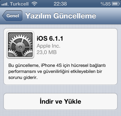 Kablosuz bağlantı üzerinden gerçekleştirilebilen iOS 6.1.1 versiyonlu yazılım “iPhone 4S için hücresel bağlantı performansını ve güvenilirliğini etkileyen bir sorunu gideriyor”. iPhone Türkiye’nin de belirttiği gibi iOS 6.1.1 güncellemesi sadece iPhone 4S için yayınlandı. Diğer cihaz sahipleri için Yazılım Güncelleme bölümünde yeni bir sürümün çıktığına dair herhangi bir bildirim yer almıyor. iOS 6.1.1 ile birlikte tüm sorunların çözüleceği söylendiğine göre iPhone 4S kullanıcıları rahat bir nefes almış olmalı.