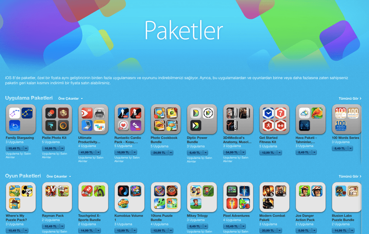 Apple iOS 8 ile birlikte App Store’dan uygulama paketleri satmaya başladı. iTunes App Store’da yer alan Paketler sayfası içinde aynı geliştiricinin birden fazla uygulamasını özel bir fiyattan ve tek seferde satın almak mümkün oluyor. Paketler tıpkı iOS cihazlarında yer alan uygulama klasörlerine benzer bir görünümde sergileniyor.