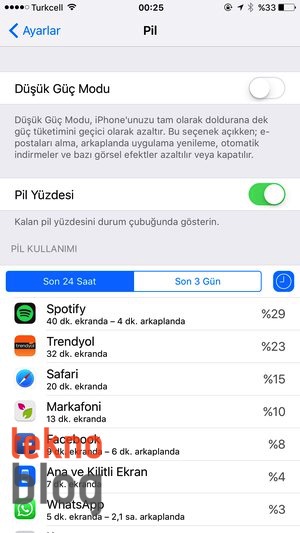 Pilinizin yüzde 10 seviyesine düştüğünü görmeseniz de, pil ayarlarına girerek iPhone’unuzun pilini neyin sömürdüğünü görebilirsiniz. En iyi tarafı listenin en başındaki küçük saat ikonuna tıklamak. Bunun sayesinde herhangi bir uygulamanın ekranda veya arkaplanda kalma sürelerini görebilirsiniz. Böylelikle hangi uygulamaları tutmak, hangilerini silmek konusunda önemli fikirler edinebilirsiniz.