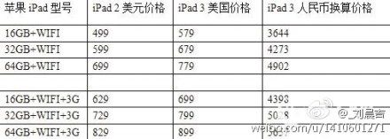 Mart ayına yaklaştıkça iPad 3’e dair dedikodular gittikçe artmaya başladı. Gün içinde verdiğimiz işlemciye dair haberlerin üstüne, son olarak da iPad 3’ün fiyatına ve çıkış tarihine dair yeni dedikodular ortaya çıktı. Macrumours’un Çinli mikro blog sitesi Sina Weibo’da çıkan bir fotoğrafa dayandırarak verdiği habere göre iPad 3’ün dolar üstünden piyasaya çıkış fiyatı halihazırdaki iPad 2 fiyatlarının Wi-Fi modellerde 70 ila Wi-Fi + 3G modellerde ise 80 dolar üstünde olacak.