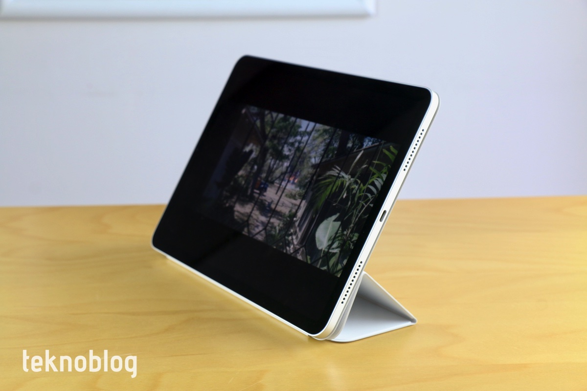 Bu aksesuarlar ile iPad Air’ın sunduğu deneyim daha da zenginleşiyor. Buna ek olarak, tableti kalınlığı ve ağırlığı artmadan muhafaza etmek ve taşımak, gerektiğinde de bir şeyler izlerken ya da görüntülü görüşme yaparken rahatlıkla kullanmak isteyenler için da Smart Folio aksesuar önerilir. Bu aksesuarı da kutusundan çıkarıyoruz.