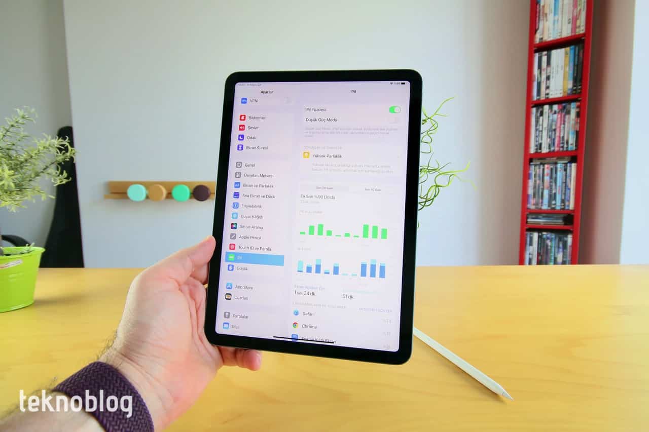 Pil tarafına geldiğimizde Apple, iPad Air’da iPad Pro 11 inç modeliyle hemen hemen aynı kapasitede pile yer veriyor. Ve bu pilin normal kullanımda 10 saate kadar kullanım imkanı sunduğunu belirtiyor. Ekran, pil tüketiminde en fazla rolü oynayan unsur. Parlaklığı maksimumda tutarsanız, pil süresini de dikkate değer oranda kısaltmış olacaksınız. Eğer pili idareli kullanmak ve günün büyük bir kısmına yaymak istiyorsanız, en güzeli ekran parlaklığını en azından yüzde 50 değerine düşürmek olacaktır. iPad Air’ı işleriniz için ana cihaz olarak düşünüyorsanız ve sık biçimde kullanacaksanız, tek bir şarjla sabahtan akşama işinizi görecektir. Eğer bilgisayarın yanında bir yardımcı olarak düşünüyorsanız, iki günde bir şarj etmek yeterli oluyor. Apple, kutuya 20W güç adaptörü de yerleştirmiş. Bu sayede adaptör için ek masrafa gerek yok. Üstelik USB-C uçlu bu aksesuarı, eğer varsa iPhone’unuzu şarj etmek için de kullanabilirsiniz. USB-C portunun varlığı, iPhone ve diğer cihazları bu port üzerinden kabloyla şarj etmeye de izin veriyor. Eğer iPad Air’ın şarjı konusunda bir endişeniz yoksa, tablet çantanızda dururken iPhone, AirPods, Apple Watch ve benzeri cihazları şarj etmek için tableti kullanabilirsiniz.