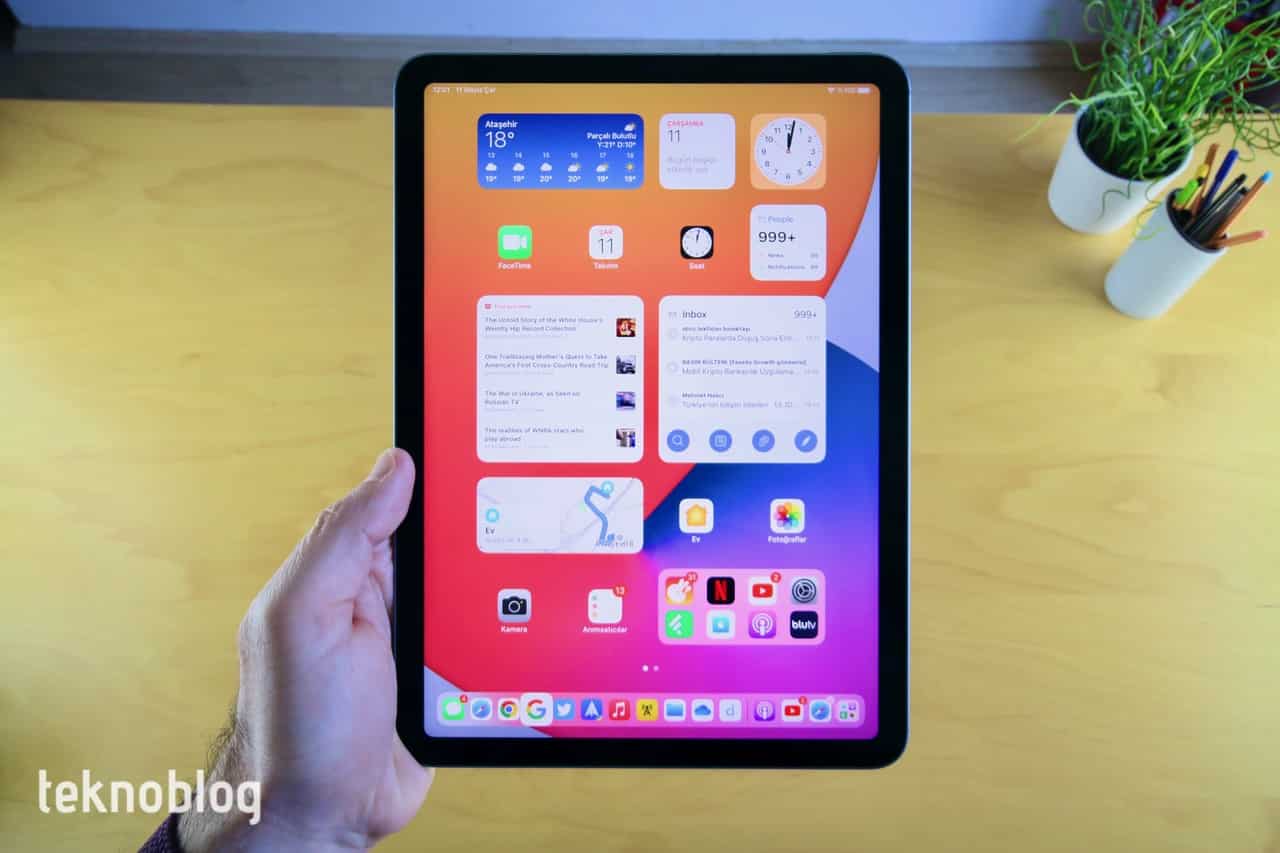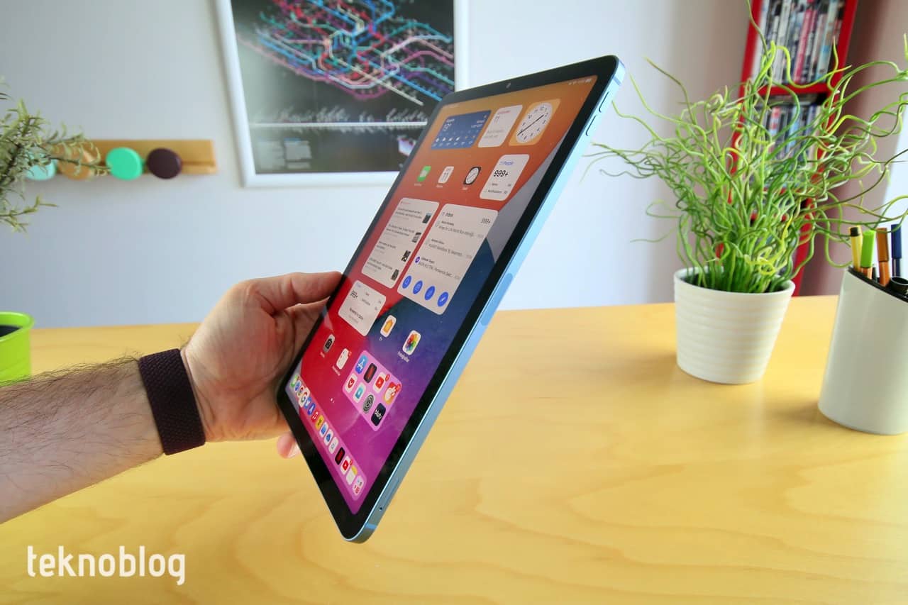 Apple yine farklı renk seçenekleri sunuyor. Farklı renkler, iPad Air’ı iPad Pro’dan ayıran, onu biraz daha ana akım kullanıcıya hitap eder hâle getiren unsurlar arasında bulunuyor. Uzay Grisi, Yıldız Işığı gibi biraz daha klasik renklerin yanında Pembe, Mor ve Mavi gibi daha farklı renkler mevcut. Bizim elimizde 2022 model iPad Air ile birlikte gelen Mavi renk var ve oldukça hoş görünüyor.