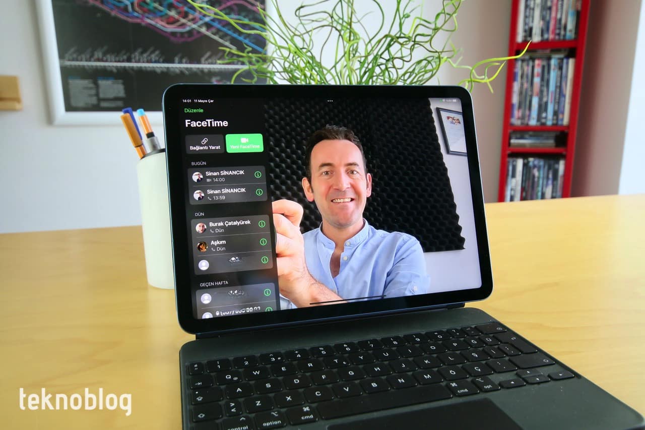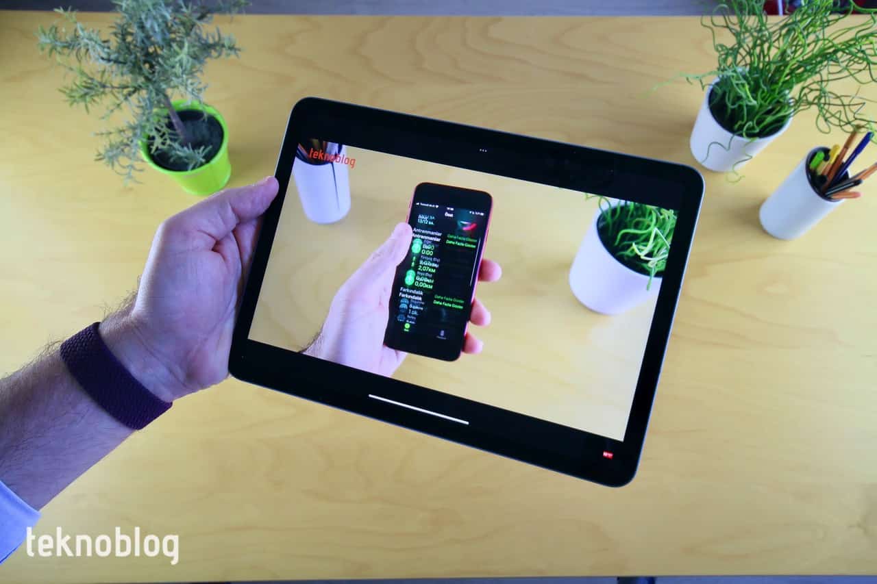 Ön tarafta ise f/2.4 diyafram açıklıklı ve 122 derecelik geniş görüş açısına sahip 12 megapiksel ultra geniş ön kamera var. Geniş görüş açısı yardımıyla Apple’ın Ana Sahne olarak adlandırdığı özellik verimli biçimde kullanılıyor. Ana Sahne görüntülü görüşmelerde sizin veya yanınızdaki kişilerin sahnede tam olarak ortalanmasını ve iyi bir görünüm sağlanmasını mümkün kılıyor. Kamera sizi takip ediyor veya birisi konuştuğu anda dikkati ona kaydırıyor. Yani profesyonel bir TV kamerasıyla çekim yapılıyormuş hissini uyandırıyor. Bunu da genel olarak iyi şekilde yapıyor. Yalnızca iPad Air’ı elde tutup başka kişileri göstermek isterken bir yandan da konuştuğunuzda Ana Sahne kime odaklanması gerektiği konusunda kararsızlık yaşayabiliyor. Bunun dışında, iPad Air’da kullanmasını en çok sevdiğimiz özelliklerden biri oldu. FaceTime’ın dışında Zoom ve Webex gibi uygulamalar tarafında da destekleniyor.