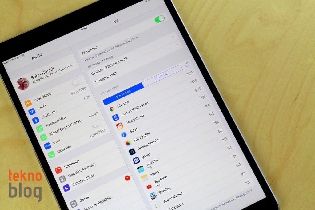 Daha parlak, daha yüksek çözünürlüklü ve üstün birçok nitelikle donatılmış ekrana, aynı zamanda A10X Fusion gibi güçlü bir işlemciye rağmen, pil ömrü tarafında Apple, iPad’lerde sunmuş olduğu pil ömrü seviyesini korumayı başarıyor. Apple’ın belirttiğine göre, normal yoğunluklu kullanımda bu tablet 10 saate varan pil ömrüne ulaşabiliyor. Pratikteki duruma baktığımızda da, izlenimlerimizin Apple’ın verdiği değerle uyumlu olduğunu görüyoruz. Ekran parlaklığının yüzde 60-70 seviyelerinde ve hücresel bağlantının da aktif olduğu durumda, birçok pencerenin ve uygulamanın açık olduğu yoğun bir kullanımda tablet tek şarjla, 7-8 saat arası varan kullanım süresine erişebiliyor. Bu da sabahtan akşama bir gününü dışarıda geçiren kullanıcılar için yeterli olacaktır.