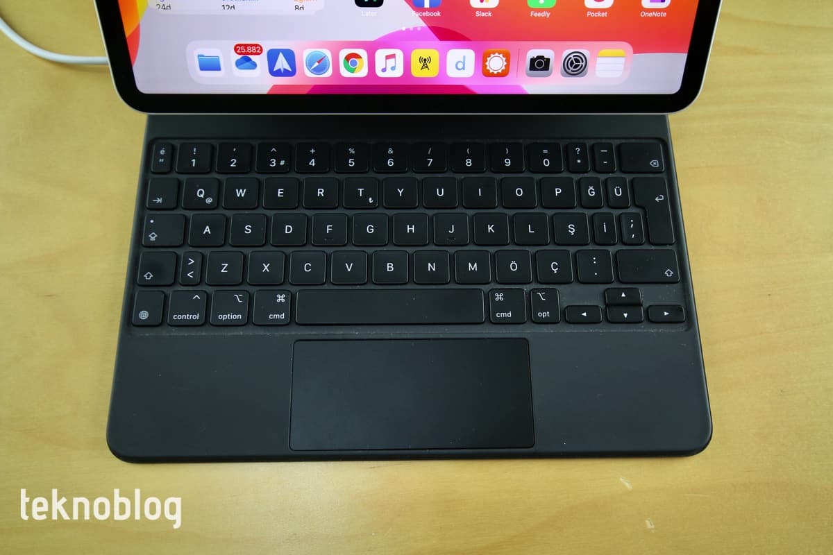 Magic Keyboard’un 11 inç iPad Pro’lara özel versiyonunun daha dar bir alan sahip olmasına bağlı olarak izleme dörtgeni ve onun her iki yanındaki bilek destek alanları dar. Özellikle bilek destek alanlarının dar olması nedeniyle yazı yazarken bilekleriniz dışarıda kalacaktır. Hatta avuç içleriniz tam da klavyenin sınırına gelebilir. Bu durum uzun süre yazı yazarken biraz rahatsızlık yaratabiliyor. İzleme dörtgeni 11 inçlik bir aksesuar için yeterli alana sahip. Bir dizüstü bilgisayarda olduğu gibi bu izleme dörtgeni rahat biçimde kullanılabiliyor. iPadOS’teki işaretçinin şekli bilgisayarda gördüğümüzden daha farklı. Biraz dokunma işleminin muadili olduğunu gösterecek şekilde küçük ve şeffaf bir daire tercih edilmiş. İşaretçi kullanıcı arayüzündeki çeşitli dokunma unsurlarına iyi şekilde uyum sağlıyor, sezgisellik yüksek. Dizüstü bilgisayarda alıştığımızdan farklı olan bu kontrol yöntemine hızlı şekilde alıştığımızı hiç çekinmeden söyleyebiliriz.