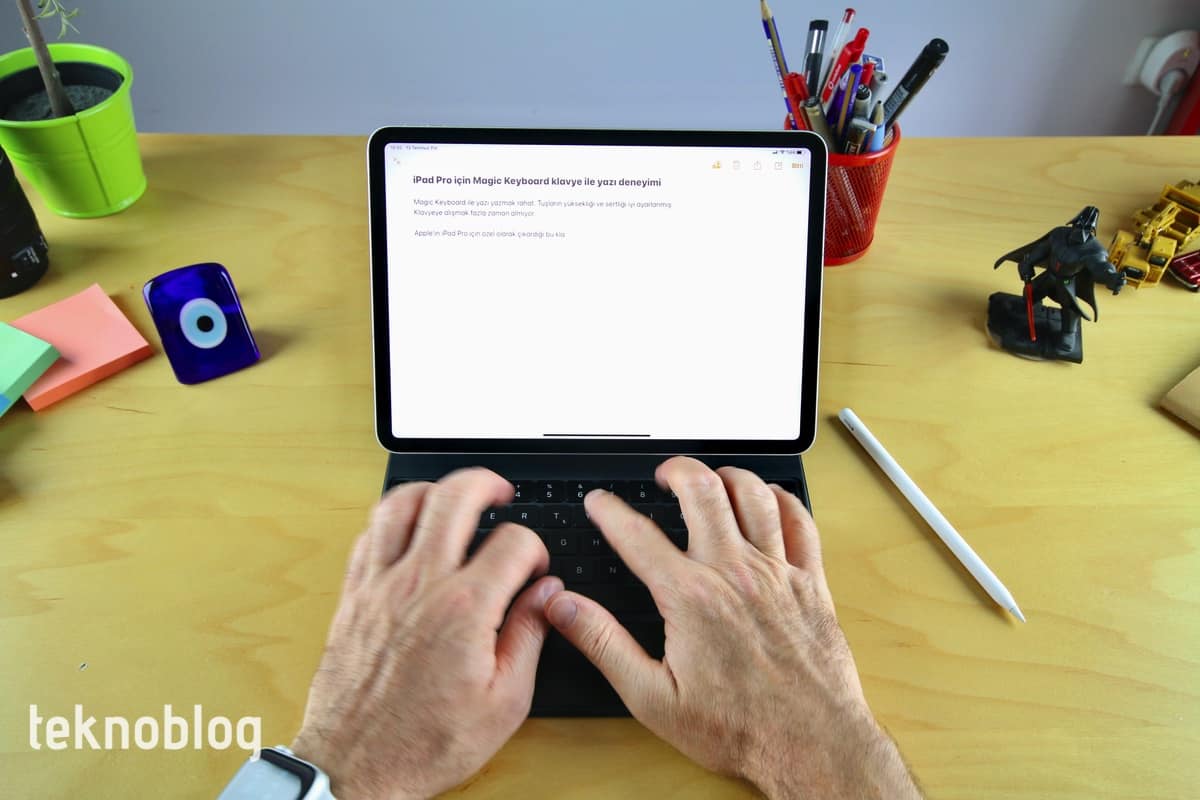 Magic Keyboard klavyeyi MacBook Air ile birlikte ilk kez bir dizüstü bilgisayarda denemiş ve oldukça iyi bulmuştuk. Tabandan yeterli yükseklikte olması ve iyi şekilde ayarlanmış derinliğiyle rahat bir yazı yazma imkanı sunuyor. iPad Pro’nun Magic Keyboard klavyesinin tuşları için de aynı yorumu yapabiliriz. Ancak 11 inçlik model için konuşacak olursak, burada alan biraz daha dar. Bu durum tuşların büyüklüklerini sınırlıyor. Yine de Apple, sık kullanılan tuşların büyüklüğünü hemen hemen MacBook Air’ın klavyesineki tuşlarla aynı tutmaya çalışmış. Sadece Türkçe klavyeye özel olarak ğ,ü,i gibi tuşların ve bazı karakter tuşlarının daha küçük tutulduğunu görüyoruz. Bu farklılıklara ve biraz daha dar alana rağmen genel olarak Magic Keyboard ile yazı yazmak çok sıkıntı çıkarmıyor. Okumakta olduğunuz bu inceleme yazısı tamamen iPad Pro’da, Magic Keyboard klavye ile yazıldı. Yazarken hiçbir şekilde işi yarıda bırakıp bir dizüstü bilgisayarda devam etmeyi düşünmediğimizi belirtmeden geçmeyelim.