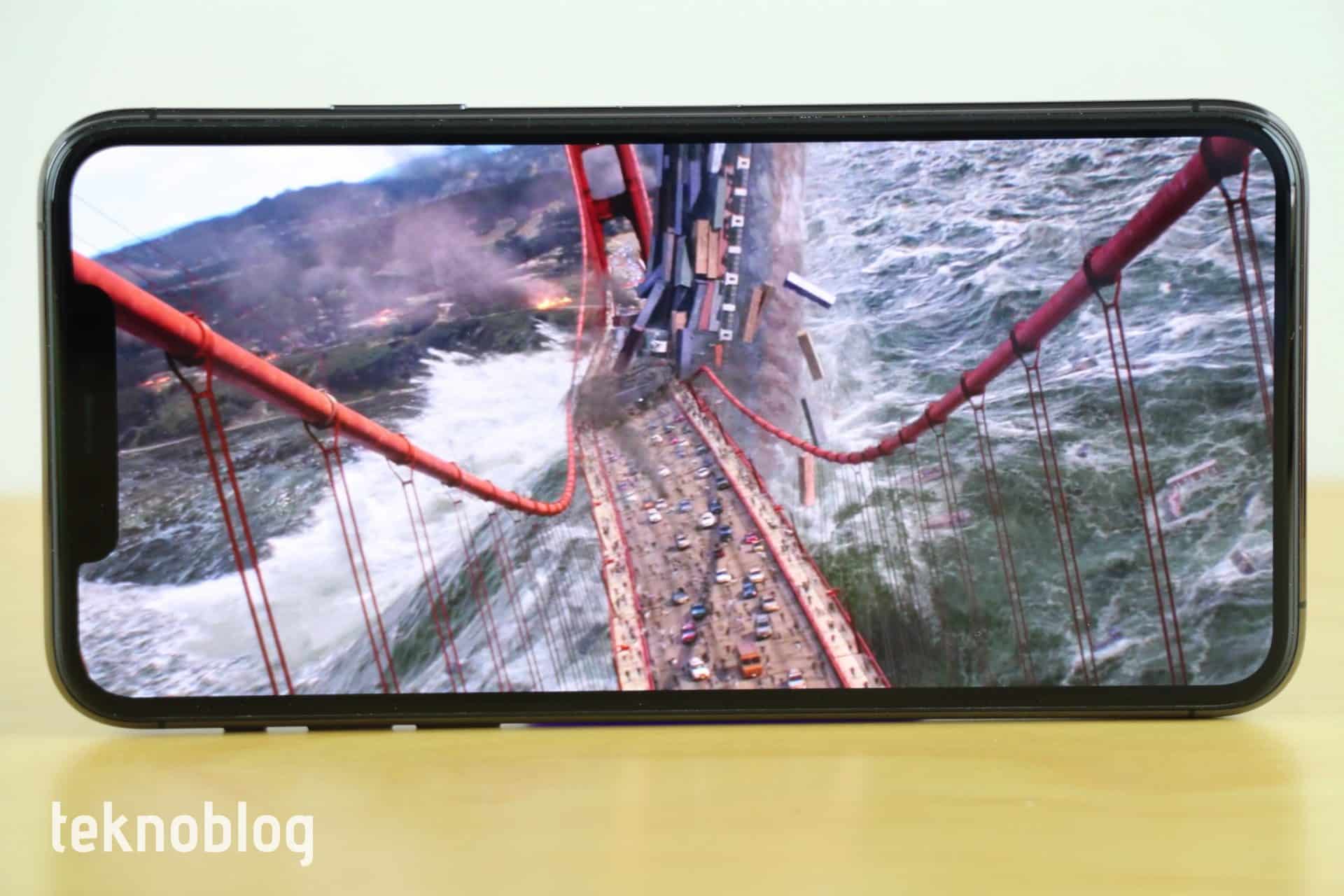 Ekranın yüksek parlaklığı HDR desteği tarafında da avantaj sunuyor. iPhone 11 Pro Max’in Super Retina XDR OLED ekranı HDR10’un yanı sıra Dolby Vision desteğini de sunuyor. Özellikle iTunes’dan indirdiğiniz filmlerde ya da Netflix’te izlediğiniz orijinal yapımların bazılarında bu desteğin farkını görebilirsiniz. Renkler daha canlı, bulut ve duman gibi görsel unsurlar biraz daha belirgin hâle geliyor. Ekranın görüntü oranı 19.5:9. Netflix’in çoğu dizisinde tam ekrana almak altta ve üstte kırpılmalara neden olduğu için tam ekranda oynatımı tercih etmedik. Benzer durum YouTube videoları için de geçerli. Ancak iTunes’dan indirdiğimiz veya Netflix’ten izlediğimiz 21:9 görüntü oranlı filmler için durum biraz daha iyi. O formattaki filmleri tam ekranda izlemek keyifli oluyor.