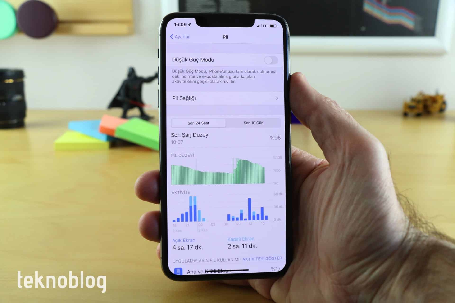 Bir örnek verelim, iPhone 11 Pro Max’i yüzde 90’lık seviyede pil doluluğuyla kullanmaya başlayıp; fotoğraf çekimi, Instagram’da video hikâye paylaşımı, sosyal medyada gezinti, yaklaşık üç saat boyunca Kişisel Erişim Noktası kullanımı, 3 saati aşkın zaman 4.5G üzerinden radyo dinleme, internette gezinme ve sosyal ağlarda güncellemeleri okuma gibi yoğun işlerin yer aldığı bir kullanımın neticesinde, tam 24 saat sonra geriye yüzde 75’lik bir doluluğun kaldığını gördük.
