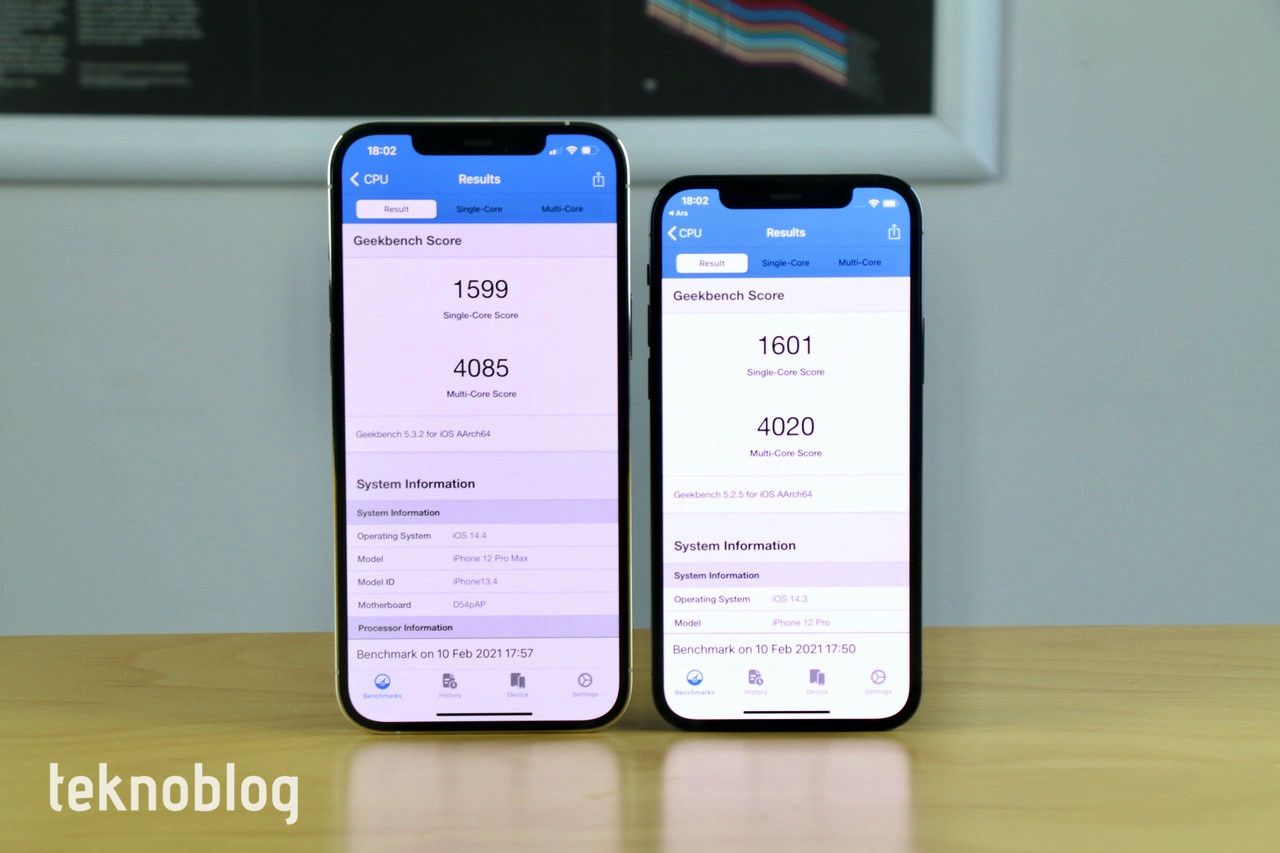 Benchmark testlerine baktığımızda ise iPhone 12 Pro Max’in daha küçük ekranlı kardeşi iPhone 12 Pro ile aynı puanları aldığını görüyoruz. Zaten bu normal, çünkü iki cihazda da aynı miktarda RAM ve aynı işlemci var. GeekBench 5 benchmark puanları hem tekli hem de çoklu çekirdekli klasmanda aynı görünüyor.