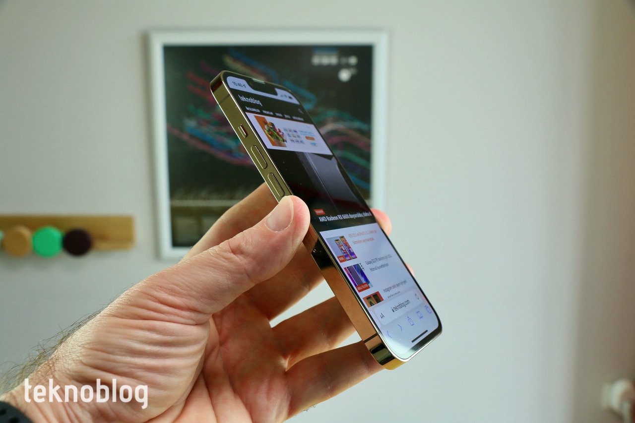 Renk seçenekleri tarafında iPhone 13 Pro’daki değişiklikler iPhone 13’tekine göre daha sınırlı tutulmuş. Grafit, altın ve gümüş gibi klasik Pro renkleri yine mevcut. Elimizde altın renkli versiyon var. Normalde altın renk favori rengimiz değildir, ancak iPhone 13 Pro’da altının tonu biraz daha açığa doğru kaçıyor. Önceki iPhone modellerinde gördüğümüz altına kıyasla açık tona sahip, beyaza yakınlığı diğerlerine nazaran daha fazla. Bu nedenle yeni modellerde bu rengi beğendik. Ancak iPhone 13 Pro’ya özel bir renge sahip olmak isterseniz, o hâlde tercihiniz Sierra Mavisi olmalı. Apple her yıl farklı bir renk seçeneğini deniyor, bu yılın rengi de mavinin özel bir tonu oldu.