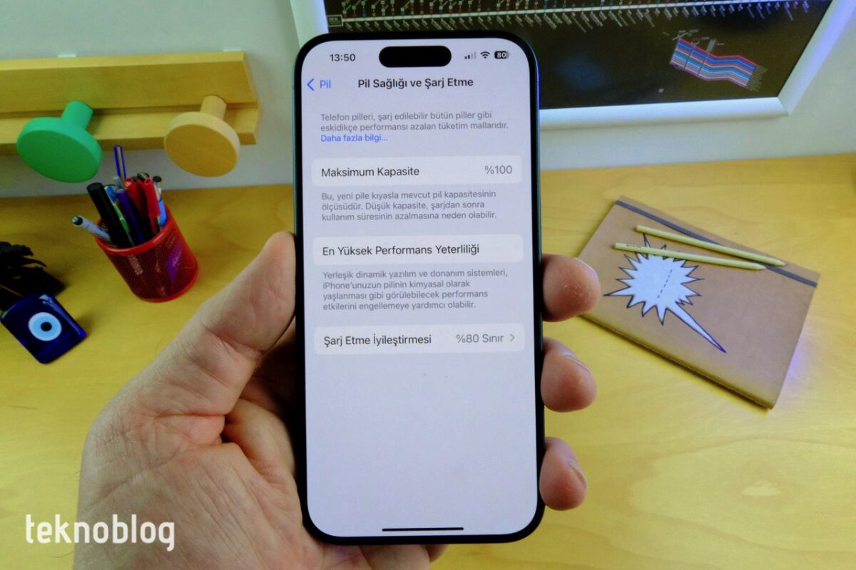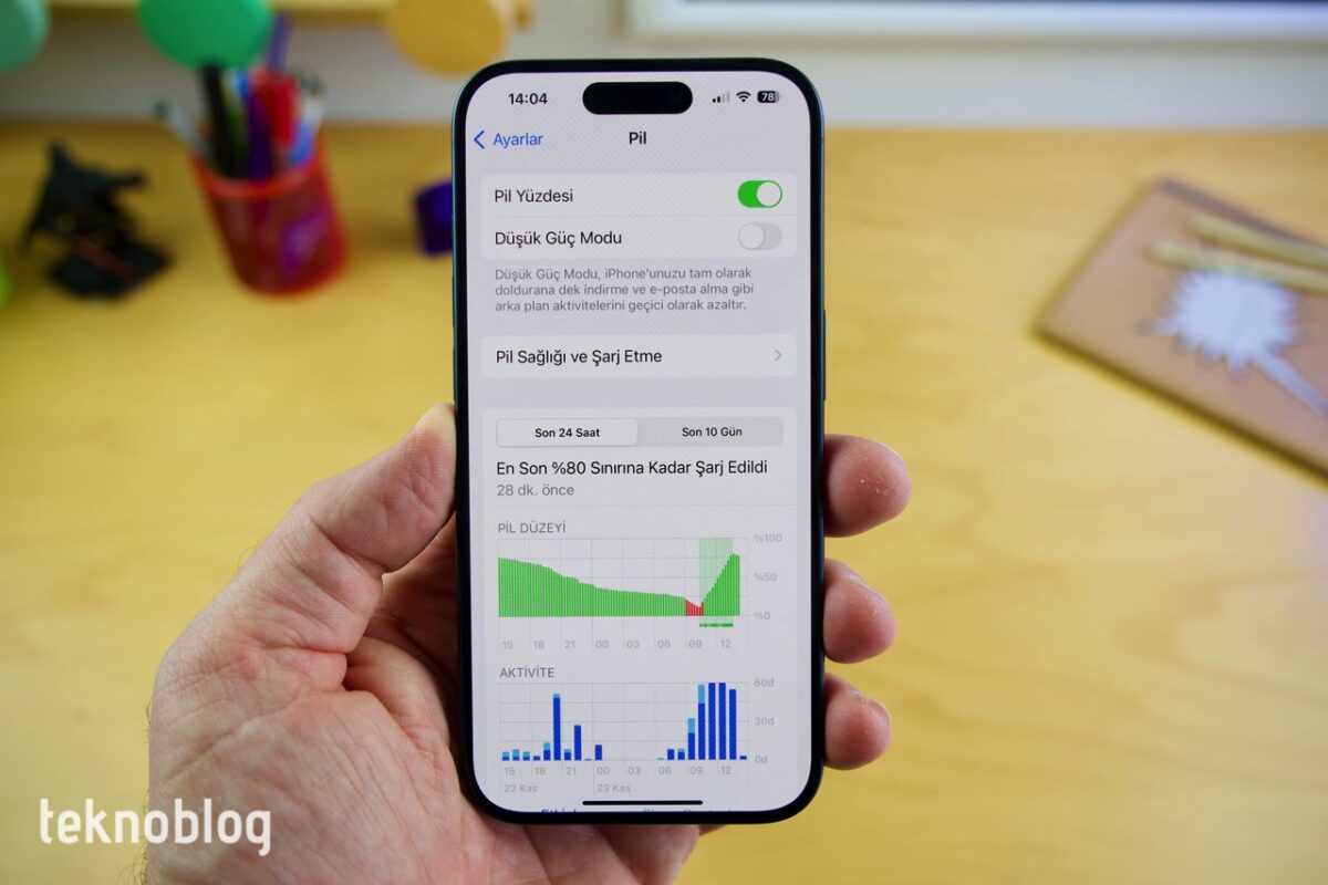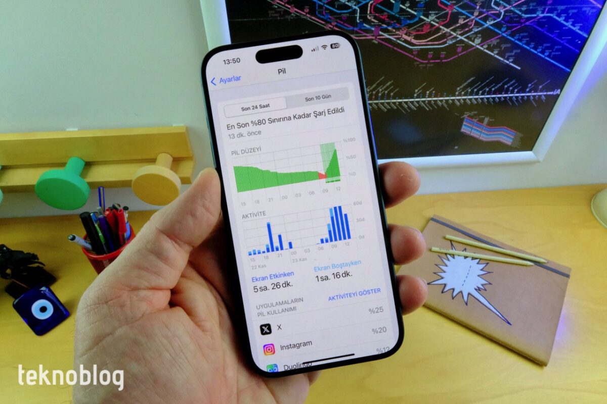 Pil tarafında iPhone 15 Pro lehine küçük bir kapasite artışı var. 3274 mAh kapasiteli pil barındıran bu model, Apple’ın A17 Pro sayesinde sunduğu verimlilik optimizasyonlarının sayesinde, parlak ve yüksek çözünürlüklü ekranına rağmen iyi bir performans sergiliyor. Genel kullanımımda tek bir şarjla 24-28 saat arasında değişen çalışma sürelerine ulaşabildim. Bir örnek vermek gerekirse, yüzde 60 dolu biçimde cuma günü saat 16.00’da şarjdan aldığım telefon, ertesi sabah saat 09.00’a kadar yüzde 7’lik bir pil seviyesine geriledi. Bu zaman zarfında ekran 4 saat 49 dakika boyunca açık durumdaydı. Ekran boşta süresi ise 2 saat 57 dakika. Bu kadar yüksek bir ekran süresine rağmen pildeki azalma yüzde 50 seviyesinin biraz üstüne çıktı. Özellikle Instagram ve YouTube arka plan aktivitesi konusunda yoğun bir grafik ortaya koyuyor. Kendi yoğun kullanımımdan yola çıkarak, iPhone 15 Pro’nun tek bir şarjla, internette gezinme, video izleme, kamera kullanma, e-posta kontrolü, sosyal medya uygulamalarını kullanma gibi ana işlerden oluşan bir senaryoda sabahtan akşama bir iş gününü rahatlıkla çıkaracağını söyleyebilirim.