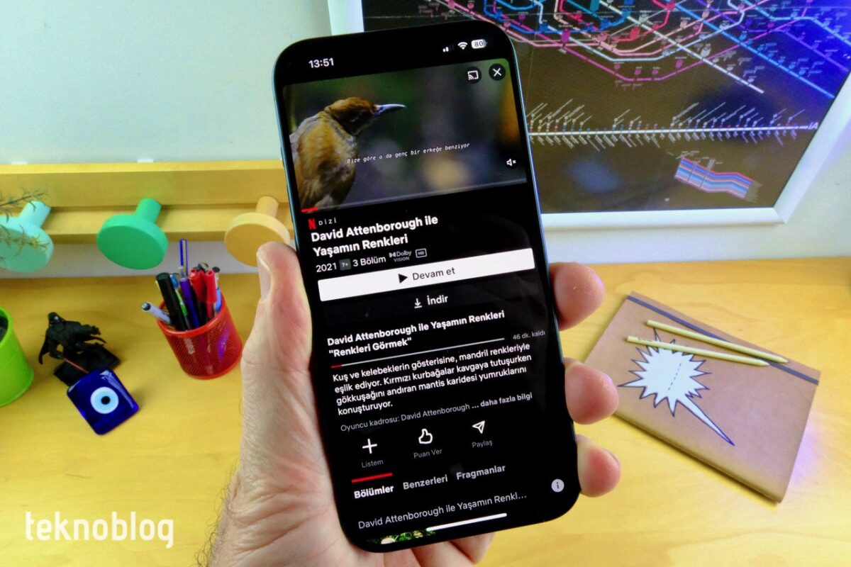 Ses tarafında da iPhone 15 Pro güçlü olmaya devam ediyor. Biri alt kenarda, diğeriyse ahize bölümünde, öne bakacak biçimde yerleştirilmiş iki hoparlör var. Öncelikle bu iki hoparlörün ses çıkışı dengeli. Sonrasında ise ses çıkış şiddeti bir hayli yüksek, akıllı telefon ortalamalarının üzerinde. Çevresel ses etkisi, doygunluk ve basların dağıtımı da iyi. Tam uzunlukta bir Netflix filmini bile iPhone 15 Pro’da, büyük bir keyifle izleyebilirsiniz.