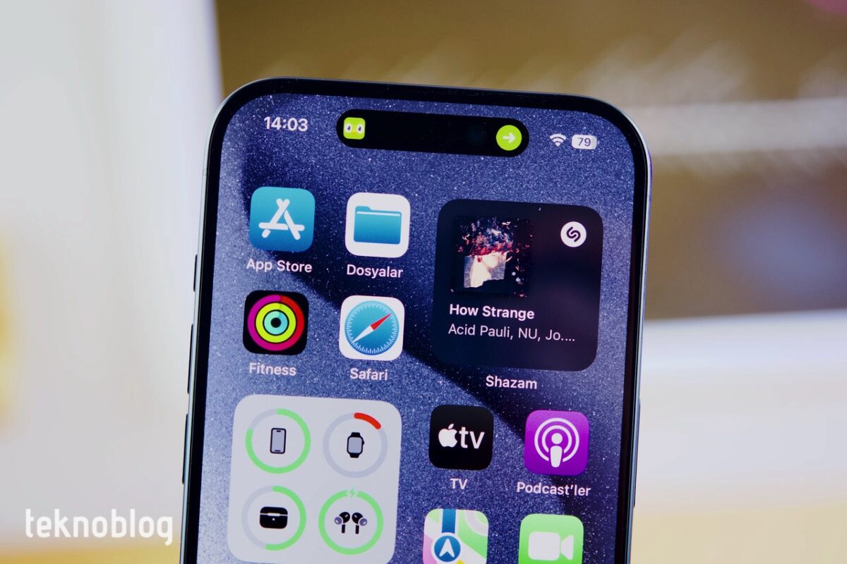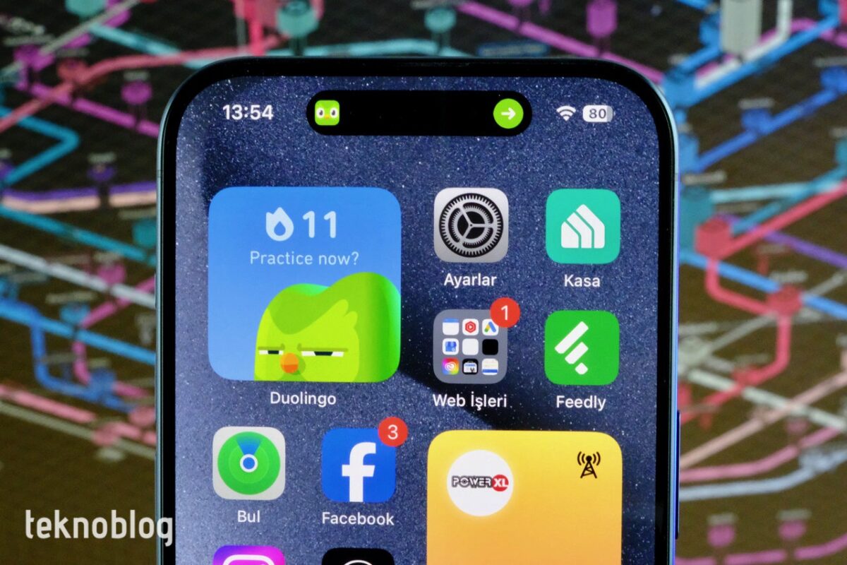 Ekran tarafına baktığımızda, daha da incelen çerçevelerin dışında herhangi bir değişikliğin olmadığını görüyoruz. Zaten iPhone 14 Pro’da çok iyi görsel deneyim sunan bir ekran vardı ve Apple bu ekranı yeni telefona da olduğu gibi taşımış. 6.1 inçlik köşeden köşeye uzunluğa sahip olan, 1179 x 2556 piksel çözünürülüklü, 19.5:9 görüntü oranlı ve 461 ppi piksel yoğunluklu LTPO Super Retina XDR OLED ekran, köşelerinde cihazın gövdesine uyum gösterecek biçimde kavis yapıyor. Ekranın üst kısmında, TrueDepth kamera sisteminin yerleştirildiği hap biçiminde bir delik var ve burası Dynamic Island olarak adlandırılıyor. iPhone 14 Pro incelememizde buradan detaylı biçimde bahsetmiştik. Geçen yıla nazaran daha fazla üçüncü taraf uygulamanın burayı kullandığını görüyoruz.