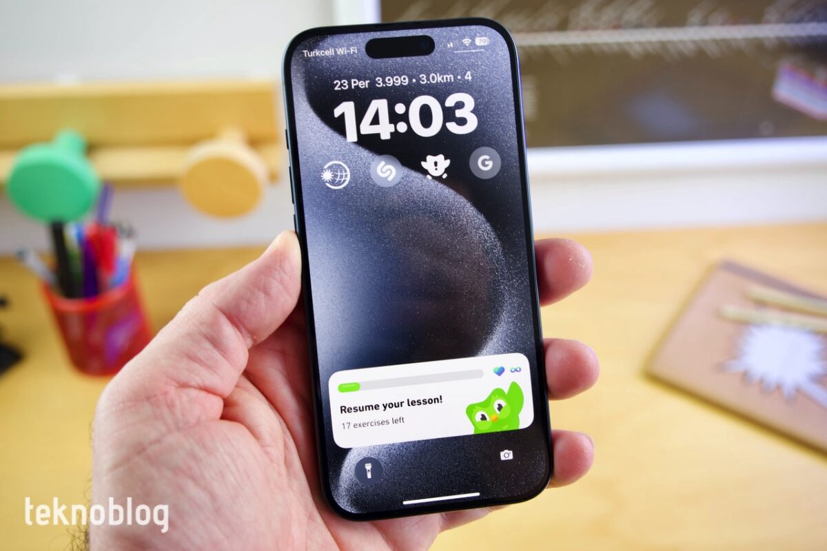 iOS 17 ile gelen bir başka yenilik olan Beklemede modu ise, iPhone 15 Pro’nun Hep Açık ekranından en iyi şekilde yararlanıyor. Özellikle çalışma masanızda, benim masamda olduğu gibi MagSafe özellikli bir stand aksesuarınız varsa, bir yandan iPhone’unuzu şarj ederken bir yandan da telefonun ekranında saati, takvimi, sevdiğiniz fotoğrafları, çeşitli araç takımlarından içerikleri görebilirsiniz. Bu özellik sayesinde iPhone bir nevi masa saati hâline geliyor. Çalışırken saatin kaç olduğunu kontrol etmek istediğimde, iPhone 15 Pro’nun olduğu tarafa bir göz çevirmem yeterli oluyor.
