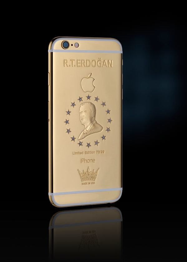 Çoğu kişi için birer statü göstergesi olan iPhone 6 ve iPhone 6 Plus zaten pahalı ürünler. Hong Kong merkezli bir şirket olan Royal Tech hem fiyatı hem de statüyü artıracak şekilde iPhone 6 ve iPhone 6 Plus 24 ayar altın kaplı özel üretim cihazlara dönüştürüyor. Üstelik bu ürünleri daha da çekici hâle getirmek için üstüne Cumhurbaşkanı Recep Tayyip Erdoğan’ın adını ve fotoğrafını da işlemeyi ihmal etmiyorlar.