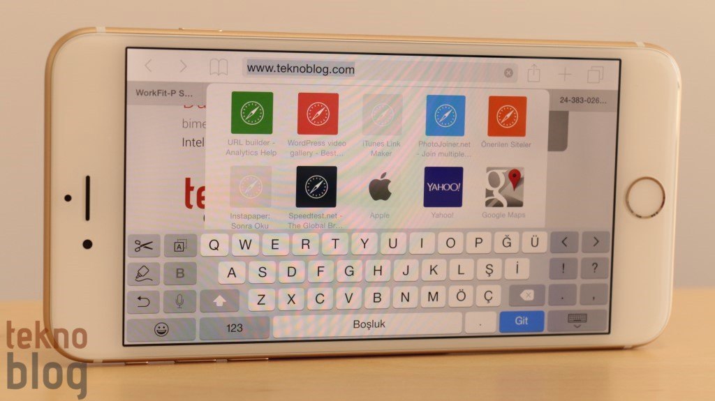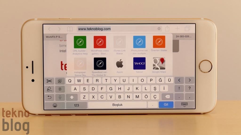 iPhone 6 Plus’ın bir başka yatay mod avantajı da klavyede ortaya çıkıyor. Standart klavye tuşlarının yanı sıra kes, kopyala, yapıştır gibi özel işlevler için de tuşlar gösteriliyor. Bu tuşlara ait simgeler pek güzel görünmüyor, anlaşılır gelmeyebilir, ancak iş gördüğü bir gerçek. iPhone 6 Plus’ta yazı yazmak ekran büyüklüğü itibarıyla kolay, bu kısayollar sayesinde verimlilik biraz daha artmış oluyor.